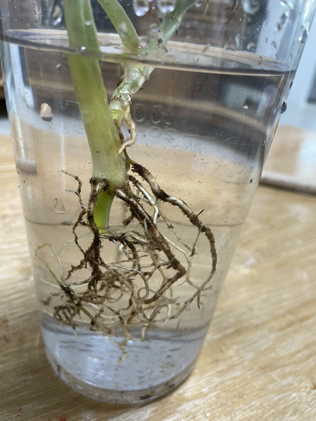 사마귀를 부랴부랴 화분에서 꺼내 씻어낸 후 뿌리 중 새까맣고 무른 부분들을 잘라냈더니 반쯤이 정리되었다. 하단의 노랗게 무른 잎사귀도 네 장 잘라냈다.