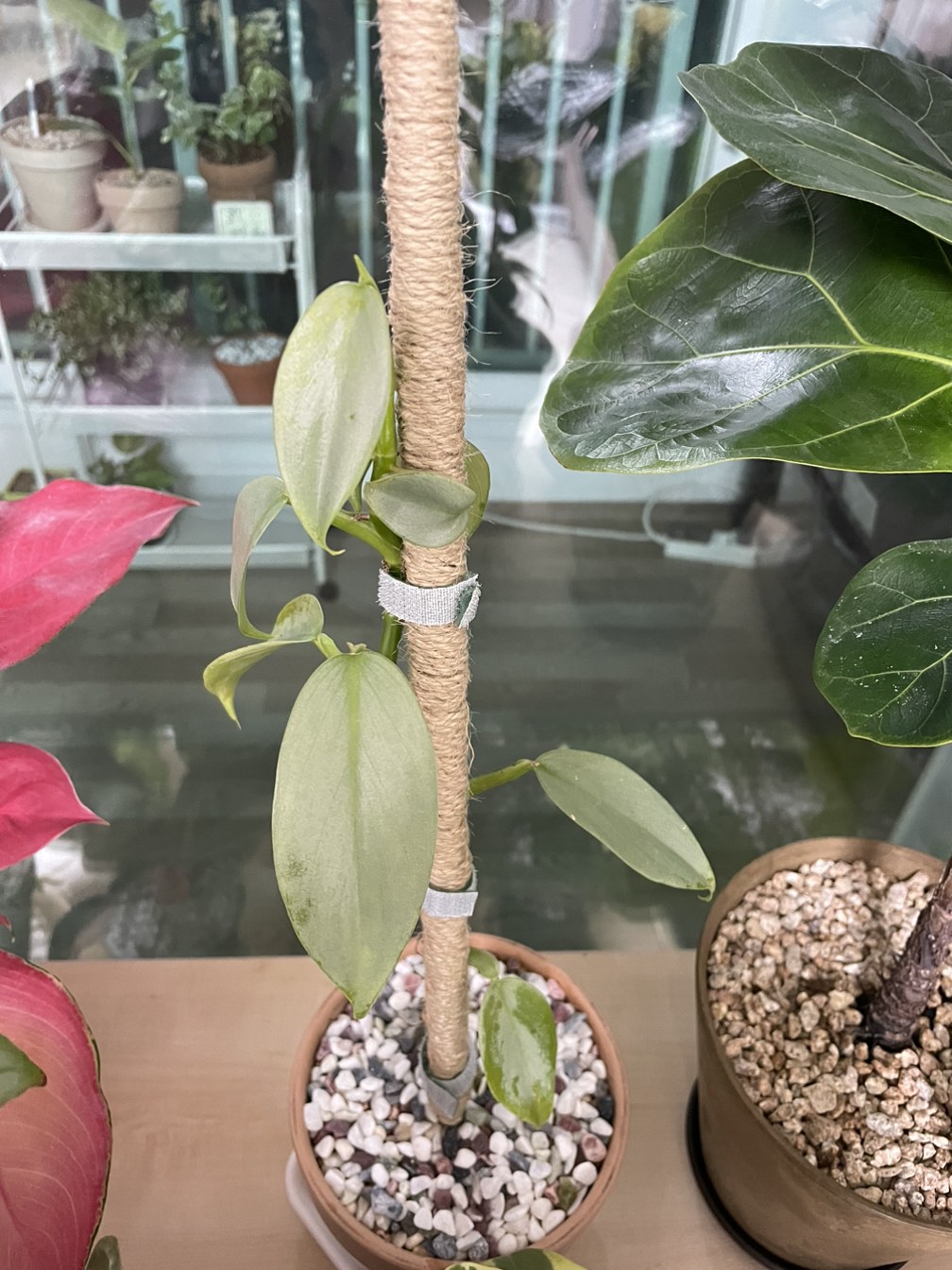 물 주는 방법을 어느 정도 터득한 이후로는 식물에게 안정기가 왔다. 작은 잎이 계속 나더니 키가 어느새 제법 커졌다. 오리발시계초를 번식하다가 남은 수태를 랩으로 필로덴드론들의 공중뿌리에 감싸줬는데 하스타텀의 저 부분 뿌리가 유일하게 수태에 활착해버려 떼지도 못하고, 아무튼 좀 못생긴 이런 상태다. 그래도 잎 색상에 자르르 흐르는 펄만은 아름답지만.