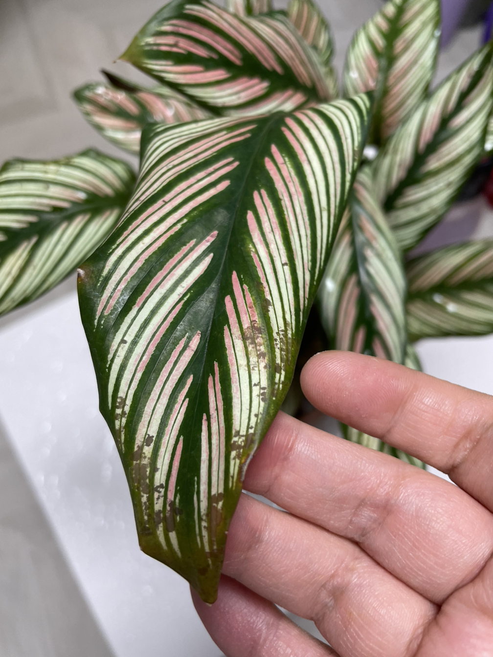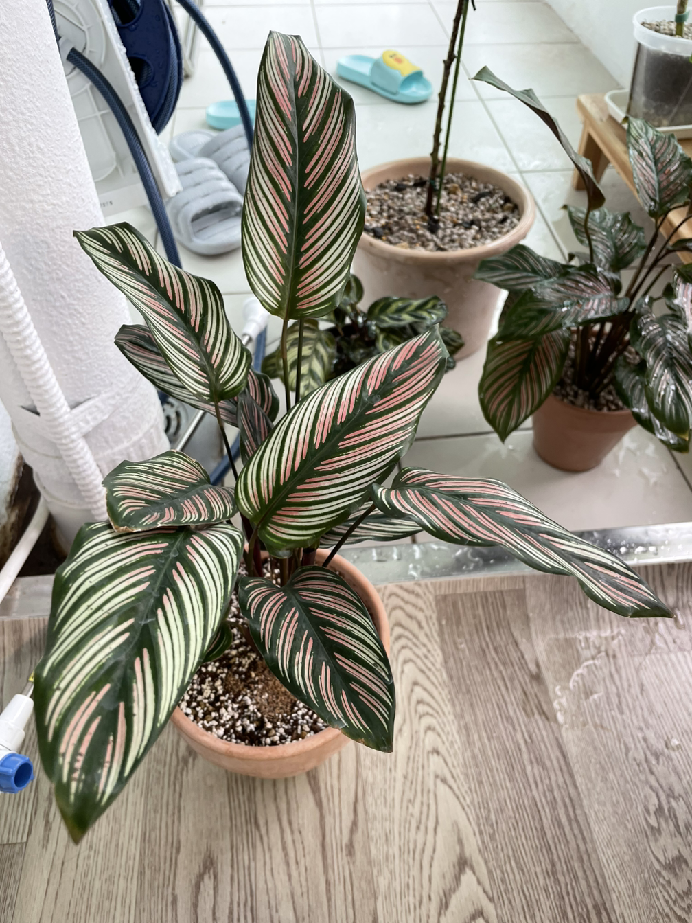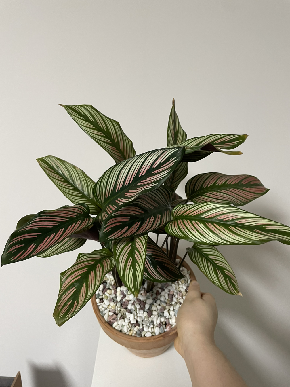 배송이 오는 순간 너무 예뻐서 놀란 식물은 처음이었다. 잎 모양과 붓으로 그린 듯한 줄무늬는 칼라데아 진저랑 똑같지만 무늬가 좀 더 굵은 필치에 흰색에 핑크색으로 그라데이션이 들어가 있어서 너무 예쁘다. 인기가 별로 없어 오프라인 매장에서 파는 곳은 별로 없지만 온라인 스토어에서는 아직 제법 팔고 있는 듯.