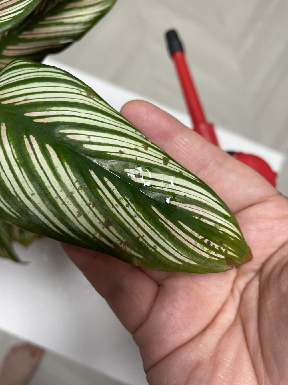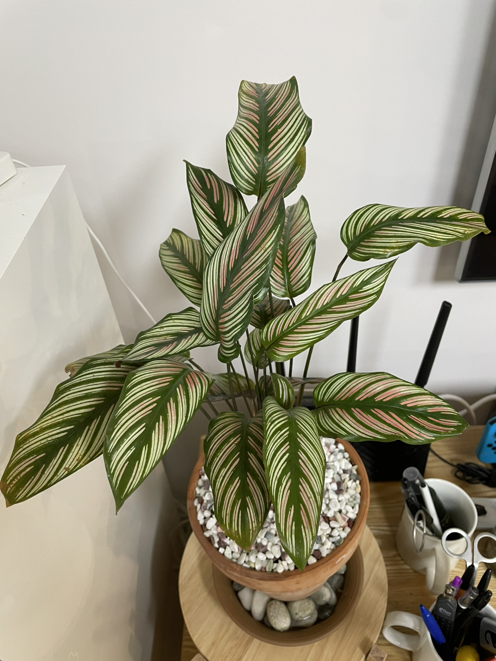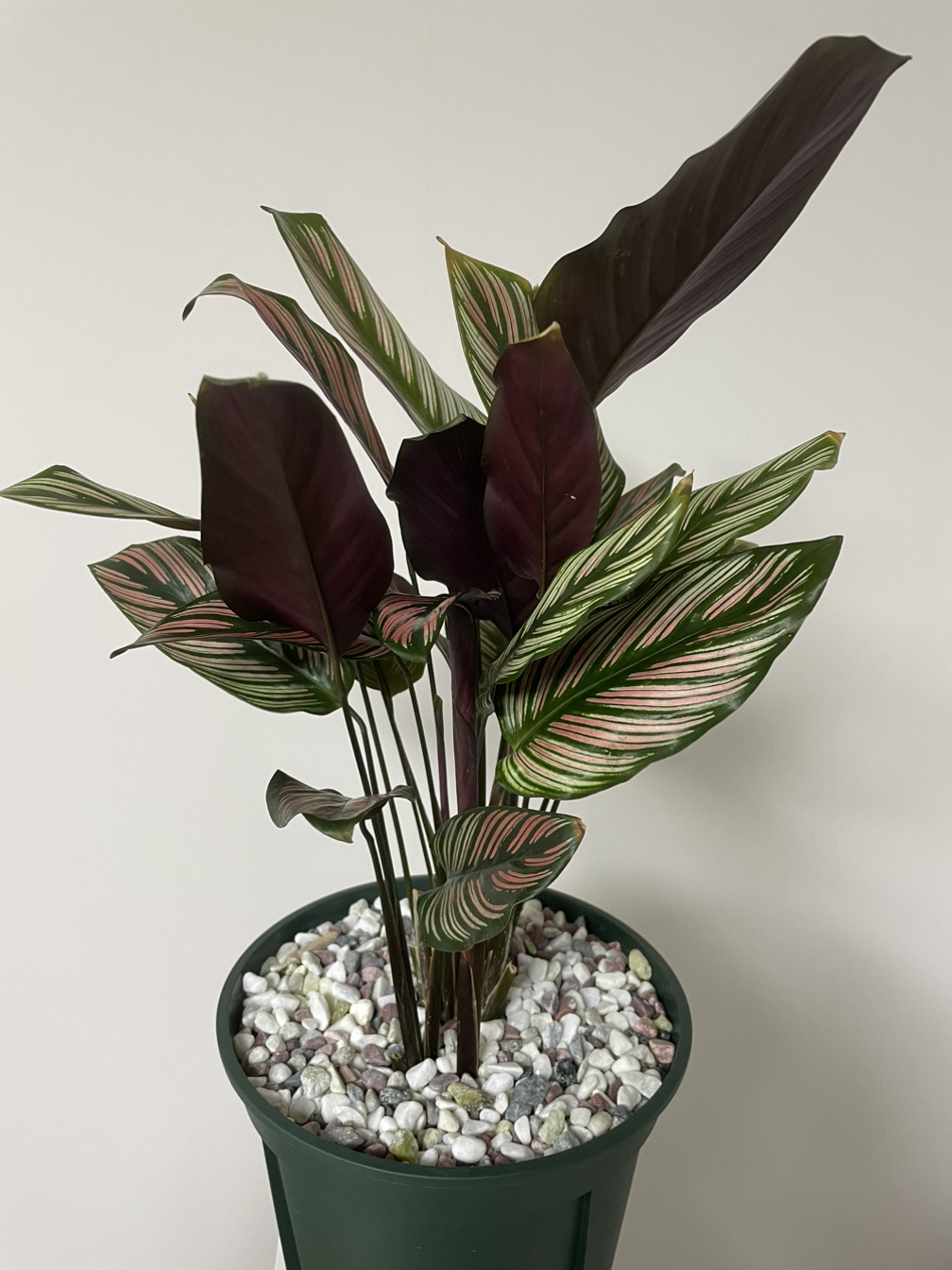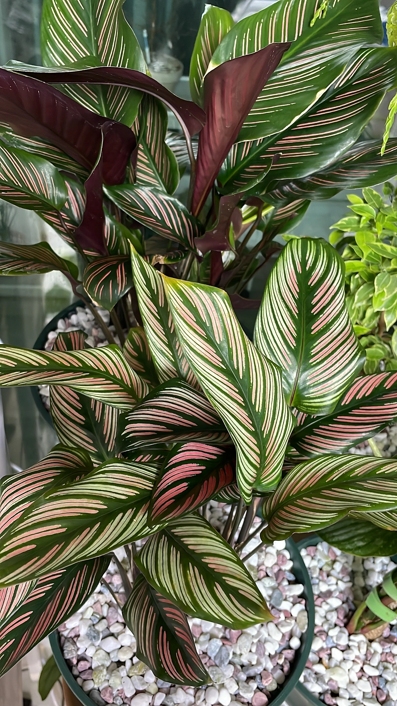 배송이 오는 순간 너무 예뻐서 놀란 식물은 처음이었다. 잎 모양과 붓으로 그린 듯한 줄무늬는 칼라데아 진저랑 똑같지만 무늬가 좀 더 굵은 필치에 흰색에 핑크색으로 그라데이션이 들어가 있어서 너무 예쁘다. 인기가 별로 없어 오프라인 매장에서 파는 곳은 별로 없지만 온라인 스토어에서는 아직 제법 팔고 있는 듯.