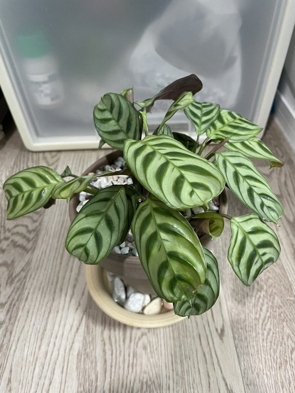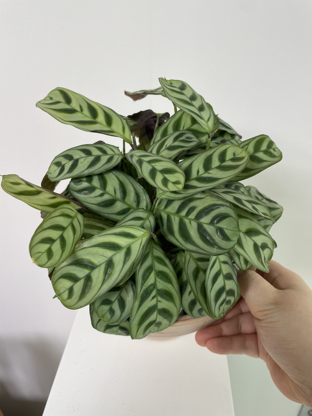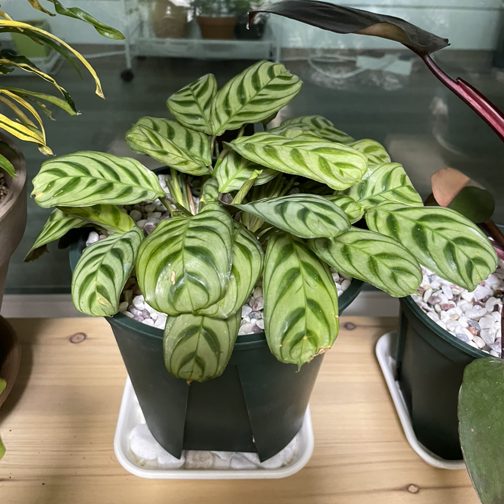 칼라데아 아마그리스라고 불리는 작년과 올해 중 크테난테속에서 가장 많이 유통되었을 것 같은 식물이 있다. 화원에서 이 식물을 자세히 들여다보면, 생선뼈같은 잎무늬들 사이에서 약간 굵은 무늬가 나오는 잎이 섞여있을 때가 있다. 약간 납작한 듯한 잎 모양에는 이쪽이 더 잘 어울리지 않나? 생각했는데 알고보니 아마그리스가 변이종, 버럴막시아이쪽이 원종이라 나름 원종으로 돌아가는 움직임이었던 모양이다.(퓨전그린으로 변신하는 퓨전화이트처럼) 평판이 좋은 편인 한 온라인 스토어에 마란타과 식물 치고는 좀 비싼 가격에 소품이 올라왔고 다소 홀린 듯 이 식물을 사게 되었다.