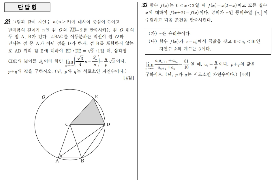 '수열의 극한'이라는 매우 한정적인 범위를 다루고 있는 미적분 과목이기에, 이렇듯 29번과 30번 내에서도 미분.적분과 관련한 문항이 아닌 '수열의 극한'과 관련한 문항이 출제되었음을 확인할 수 있습니다. 물론 23번부터 28번까지의 다른 선택과목 문항의 경우도 마찬가지입니다.