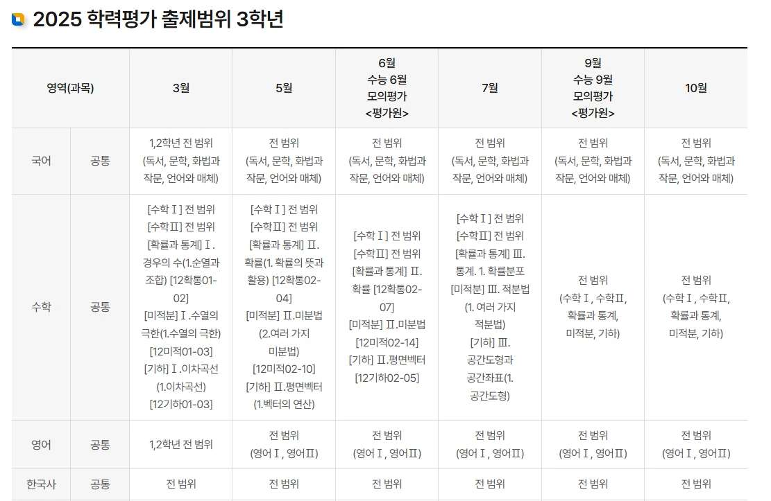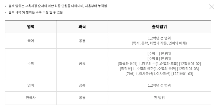 탐구 과목의 경우 수능 전 범위가 들어가는 것을 확인할 수 있지만, 수학 과목의 경우