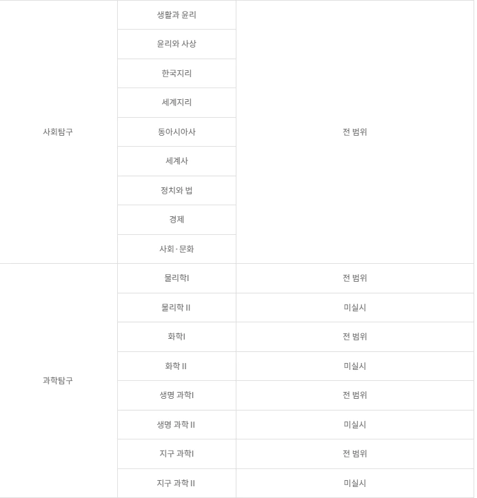 과학탐구 과목 또한 마찬가지로 전 범위가 출제됩니다만, II 과목의 경우는 실시되지 않습니다.