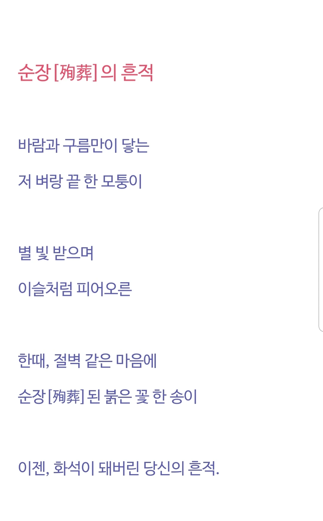 - 바람, 구름, 벼랑, 이슬, 절벽, 붉은 꽃 등 상징적 이미지들을 통해 짝사랑의 고립성과 덧없음을 표현.