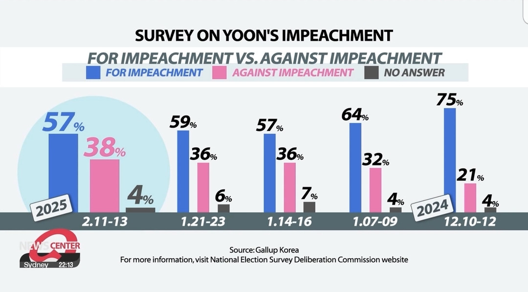 Now, the Constitutional Court does not, by any means, have an obligation to listen to public opinion, but the public does have their own opinions. Let's look at the latest data. Gallup Korea's poll of 1-thousand-and-4 people from February 11th to 13th showed that while 57-percent of the respondents were in favor of Yoon's impeachment, 38 percent weren't. This is an increase, if you look at the numbers before this, although it is moving slowly. Meanwhile, the far right number shows the polls just a week after the declaration of martial law, when 75-percent wanted impeachment while 21 percent were against it. So, there has been an apparent rise in the number of those against Yoon's impeachment as the trial progressed.