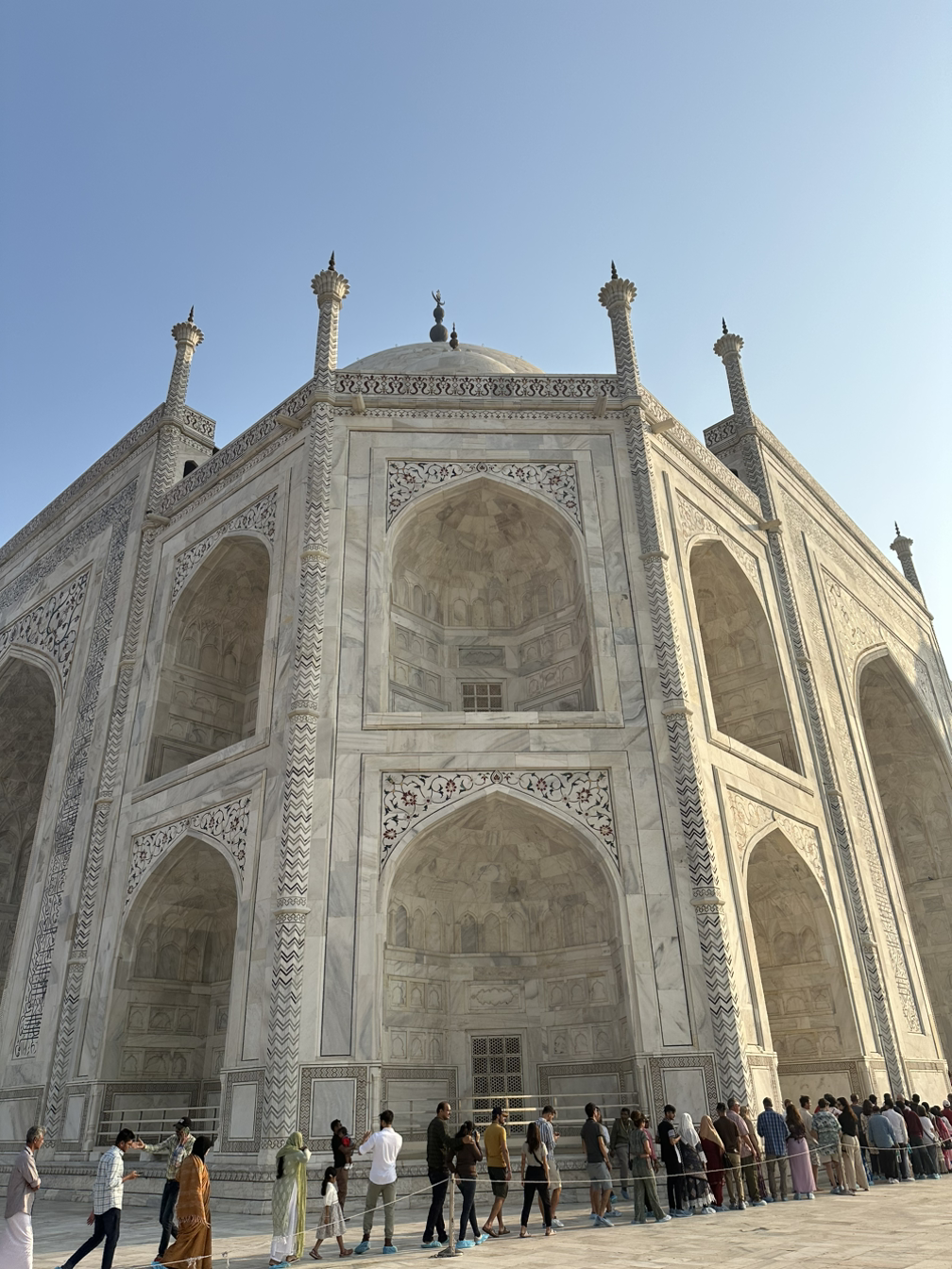 타지마할은 그 안으로 입장할 수도 있습니다. 대리석 파손을 막기 위해서 덧신을 신고 타지마할에 올라섰습니다. 가까이에서 본 타지마할은 거대합니다. 높이가 65미터에 달한다고 하니 가까이에서는 꼭대기가 보이지 않을 정도입니다. 정교하게 조각되어 있는 대리석의 아름다움을 눈으로 들여다보고 매끄러운 질감을 만질 수 있는 기회입니다. 하지만 타지마할의 아름다움은 가까이에서 들여다보기보다는 멀리에서 조망할 때 더 진가를 발휘합니다. 힘들게 올라왔지만 완벽한 대칭 구조의 아름다움을 느끼기 위해서는 다시 멀리 떨어져야 합니다.