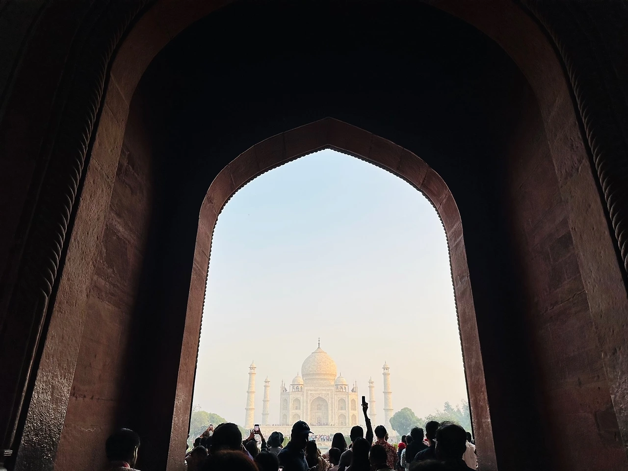 타지마할의 입구에 도착하니 벌써 꽤나 많은 사람들이 줄을 서 있습니다. 입구에서 짐검사를 하고 타지마할로 입장합니다. 입구를 지나서 타지마할로 가능 길의 양옆에도 꽤나 고풍스러운 무굴양식의 갈색 건물들이 즐비합니다. 가이드가 이런저런 설명을 해줍니다만 귀에 잘 들어오지 않습니다. 빨리 타지마할을 보고 싶은 마음입니다. 양옆으로 거대한 갈색 벽이 서 있는 가운데로 오르막길을 올라가면 드디어 타지마할의 입구입니다. 거대한 아치형 문의 가운데에 새하얀 타지마할이 모습을 드러냅니다.