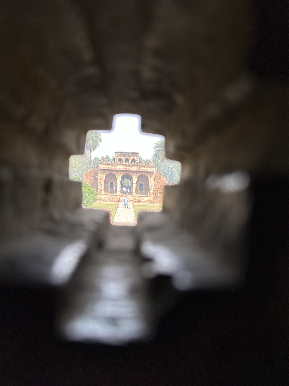여기저기 사진을 찍고 있는 저에게 다시 노인이 다가옵니다. 무덤에 대한 설명을 자청합니다. 무덤 안에 줄지어 놓여 있는 관을 가리키며 누가 묻혀 있는지 설명을 해줍니다. 가운데에 이샤칸이 묻혀있고, 그 옆에는 부인과 두 명의 자식들이 같이 묻혀 있다고 합니다. 설명을 마친 인도 노인은 다시 저를 끌고 창문으로 데려갑니다. 돌로 만든 창문은 십자가 모양의 구멍으로 장식되어 있는데, 구멍 하나를 가리키며 "베스트 포토"라고 말하며 사진을 찍는 시늉을 합니다. 그가 알려준 데로 사진을 찍어보니 구멍의 가장자리가 외부 풍경을 감싸면서 꽤나 근사한 사진을 찍을 수 있습니다.