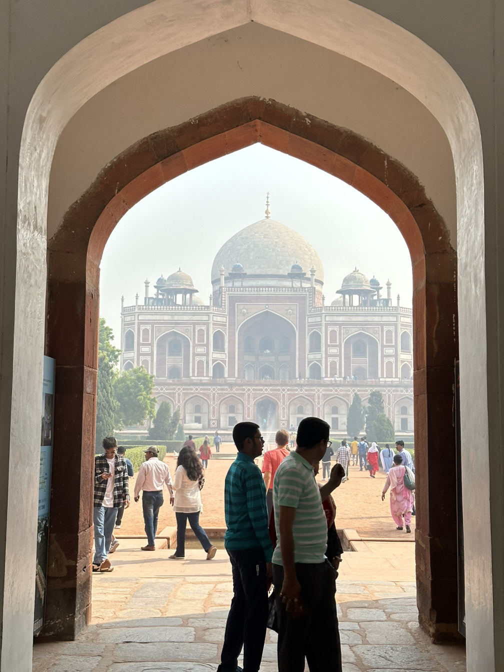 이샤칸의 무덤을 나와서 다시 갈림길로 돌아갔습니다. 후마윤의 무덤을 볼 차례입니다. 갈림길에서 100미터쯤을 걸어가자 다시 입구가 등장합니다. 타지마할에서 봤던 것과 비슷한 아치 모양의 문입니다. 아치를 통과하자 후마윤의 무덤이 보입니다. 지붕 위에 커다란 모스크돔이 얹혀 있는 모양이 타지마할과 비슷한 느낌입니다. 다만 색상은 하얀색보다는 적갈색이 주를 이루고 있고 좀 더 이슬람스러운 느낌입니다.