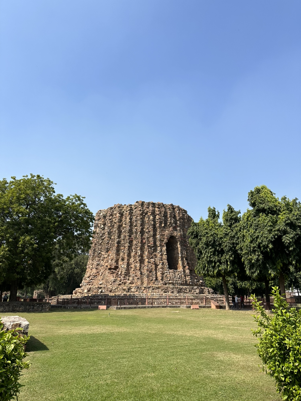 꾸뜹 미나르를 다 보고 사원을 통해서 반대편으로 이동하면 또 다른 미나르를 만날 수 있습니다. 짓다가 미완성 상태로 남겨진 '알라이 미나르'의 흔적입니다. 첨탑을 짓고자 했던 술탄은 1층만 짓고 세상을 떠났고, 그의 사후에는 공사를 계속하지 못하여 폐허로 변해버렸습니다. 원래 계획은 꾸뜹 미나르보다 두 배에 달하는 거대한 첨탑을 짓는 것이었다고 하니 만약 완공되었다면 얼마나 웅장한 모습이었을까요!