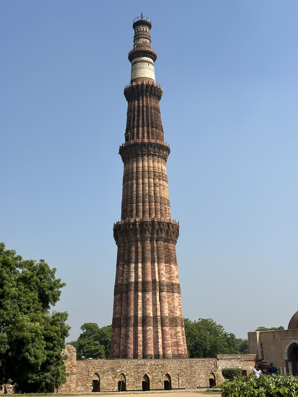 철기둥을 뒤로하고 십여 미터를 걸어가면 드디어 꾸뜹 미나르를 만날 수 있습니다. 높이 73미터, 지름 15미터의 원통형 돌탑으로 아래에서 위로 올라갈수록 좁아지는 구조입니다. 웅장한 규모도 압도적이지만 표면에 정교하게 조각되어 있는 문양이 인상적입니다. 이슬람의 성서인 꾸란의 글귀와 기하학적으로 반복되는 도형이 새겨져 있습니다. 탑은 5단으로 되어 있고 안쪽에 설치된 계단으로 꼭대기까지 올라갈 수 있다고 하지만 현재는 폐쇄되어서 안으로 들어갈 수 없습니다.