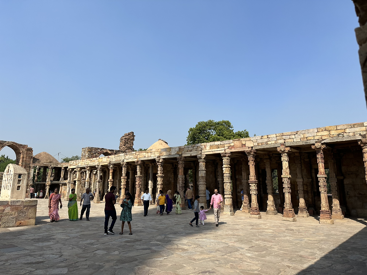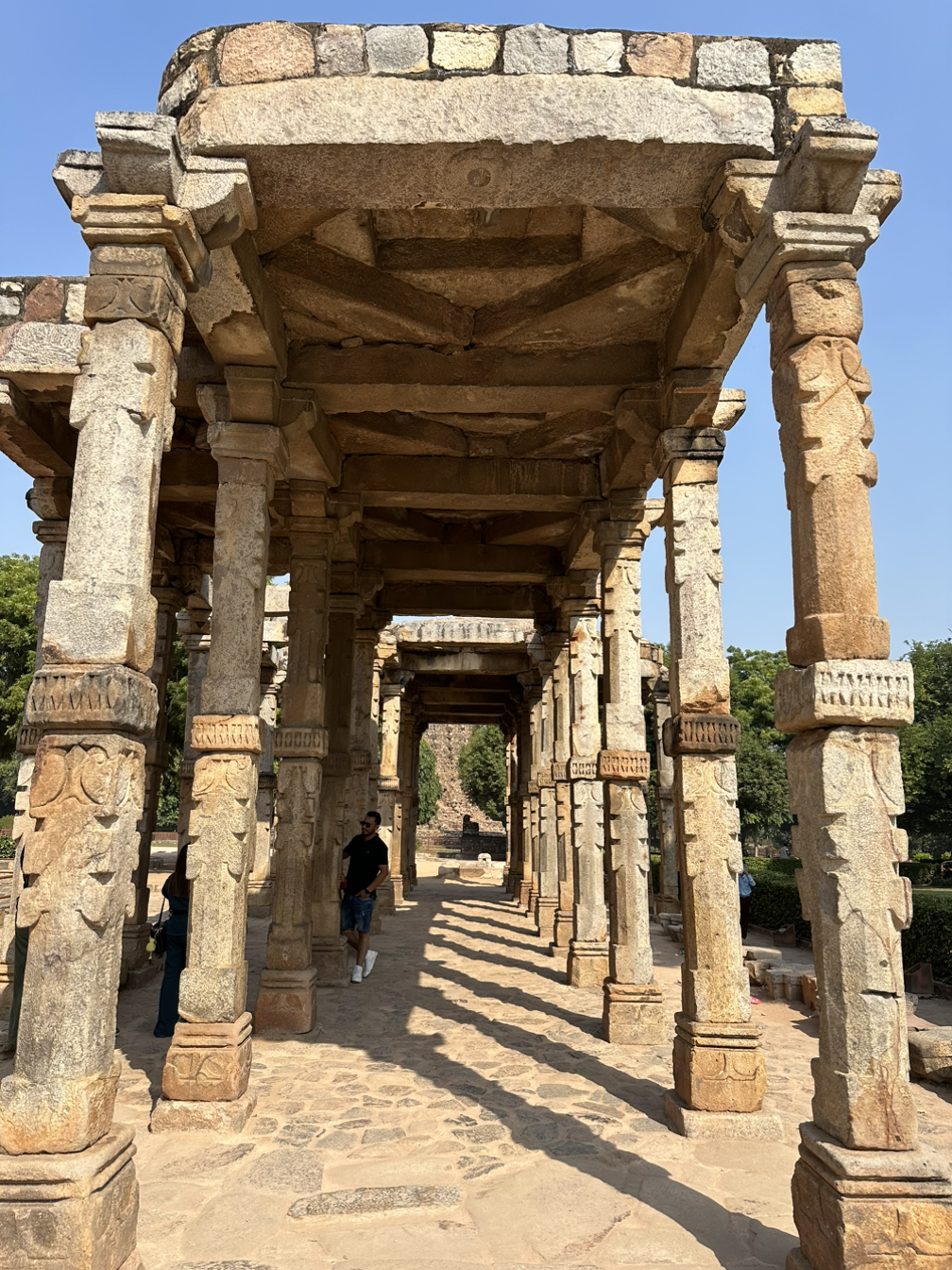 멀리 삐죽 솟아올라 있는 첨탑을 향해서 몇 발자국 걷자 뼈대만 남아 있는 석조 건물이 모습을 드러냅니다. 이단으로 구성되어 있는 한쌍의 돌기둥이 나열해 있고 그 위를 돌로 만든 지붕이 덮고 있습니다. 돌기둥과 지붕은 정교하고 화려한 문양으로 장식되어 있습니다. 인도 최초의 이슬람 사원인 '쿠와트 알 이슬람 모스크'입니다. 힌두 사원을 파괴한 자리에 세워진 이슬람 사원이라서 일부 구조물은 힌두 사원의 것을 재사용했다고 합니다만 무엇인지는 알 길이 없습니다. 곳곳에 남아있는 정교한 장식으로 과거의 호화로운 모습을 떠올려봅니다.