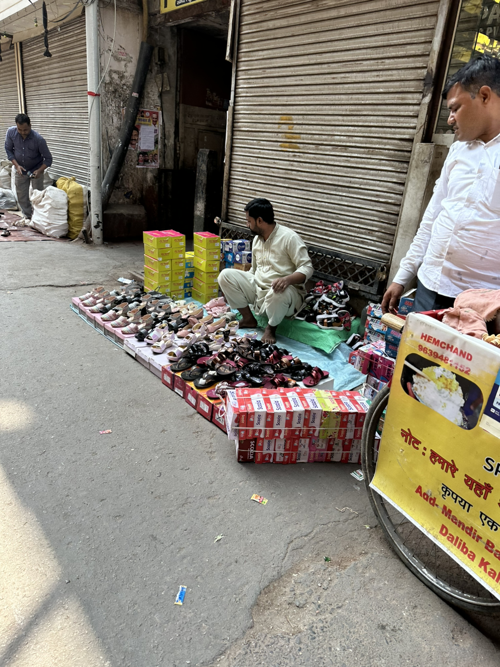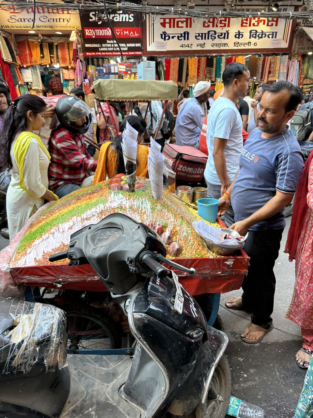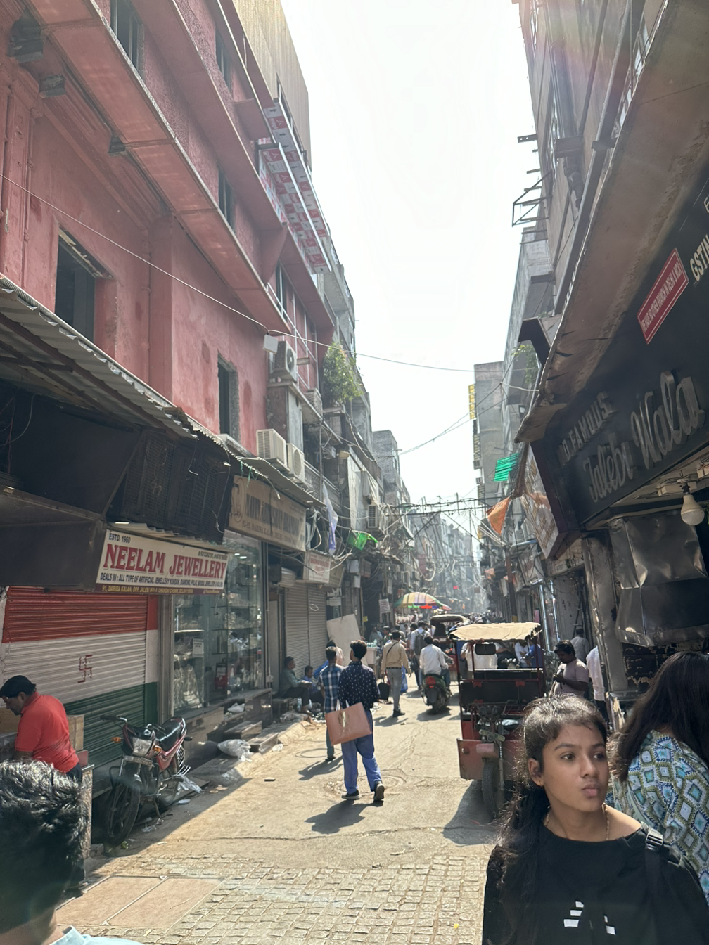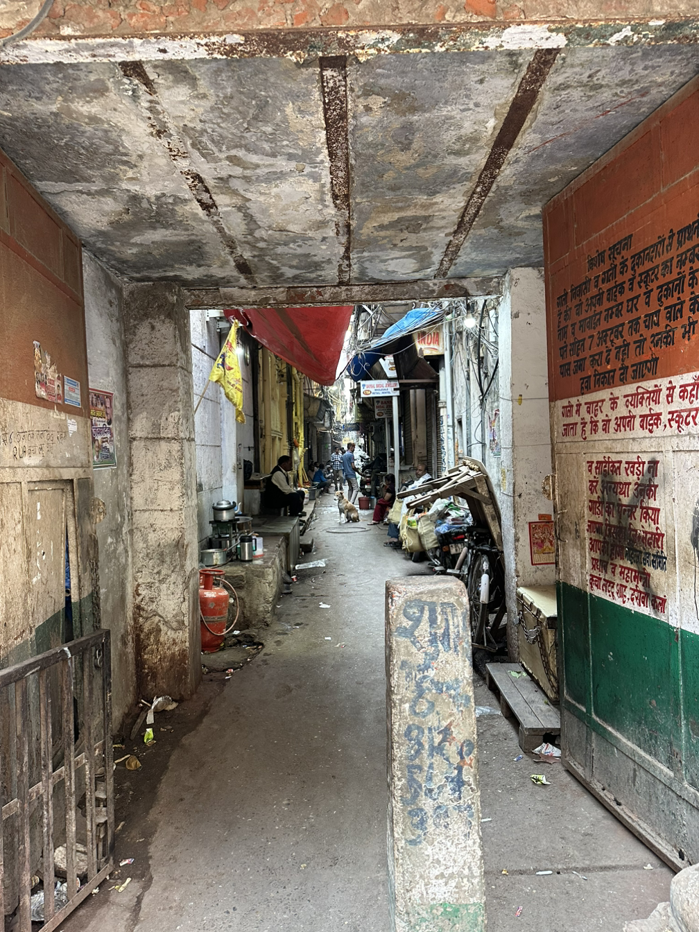 골목 안의 모습은 혼란스러운 인도의 모습 그 자체입니다. 건물에 있는 상점, 노점상, 길거리 좌판이 어지러이 뒤섞여 있습니다. 쇼핑하는 사람들 사이를 자전거 릭샤, 오토 릭샤, 오토바이가 아슬아슬하게 비집고 다닙니다.