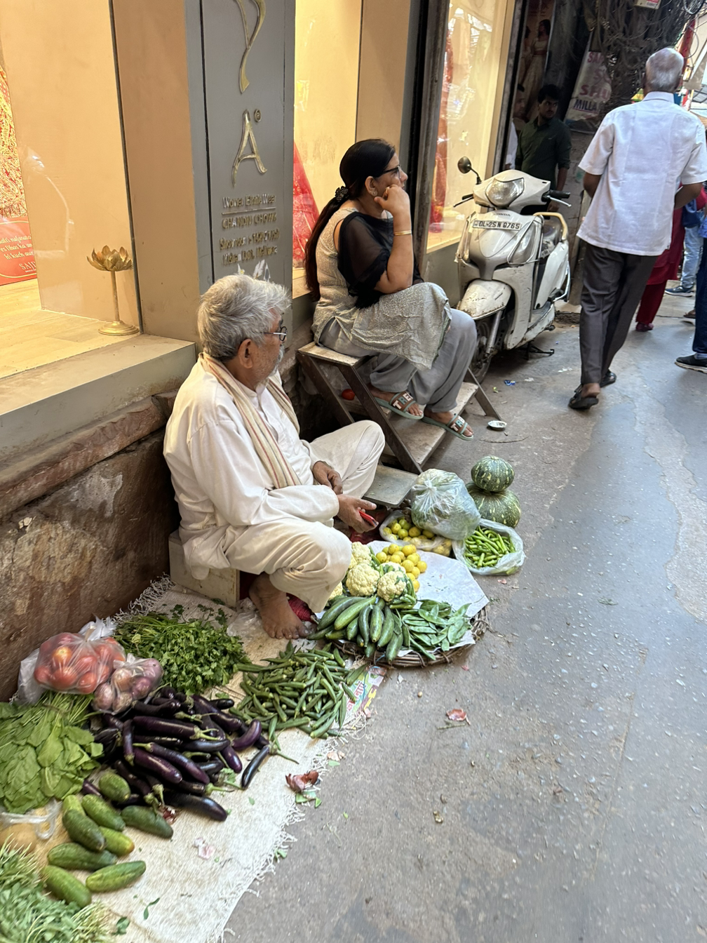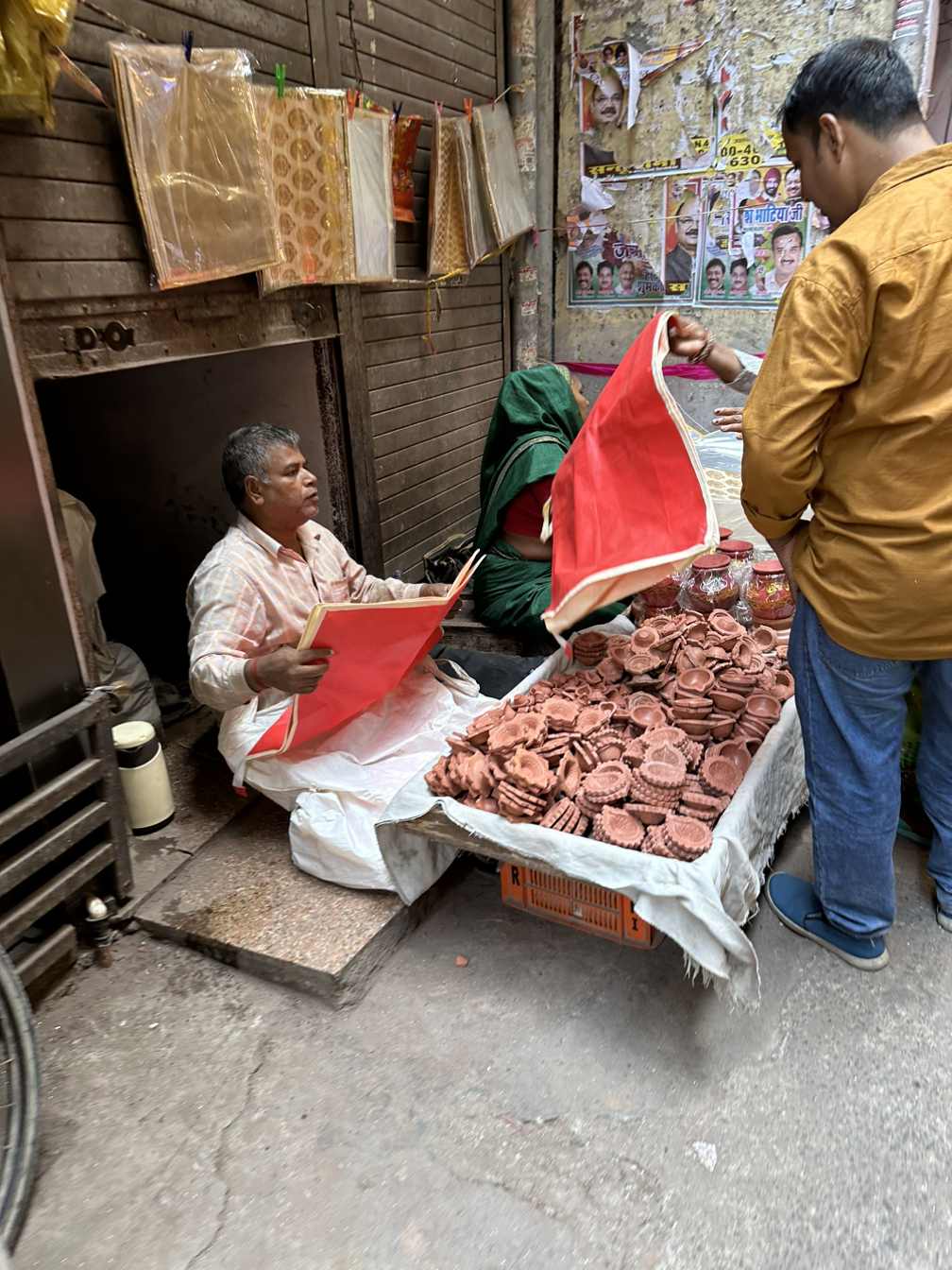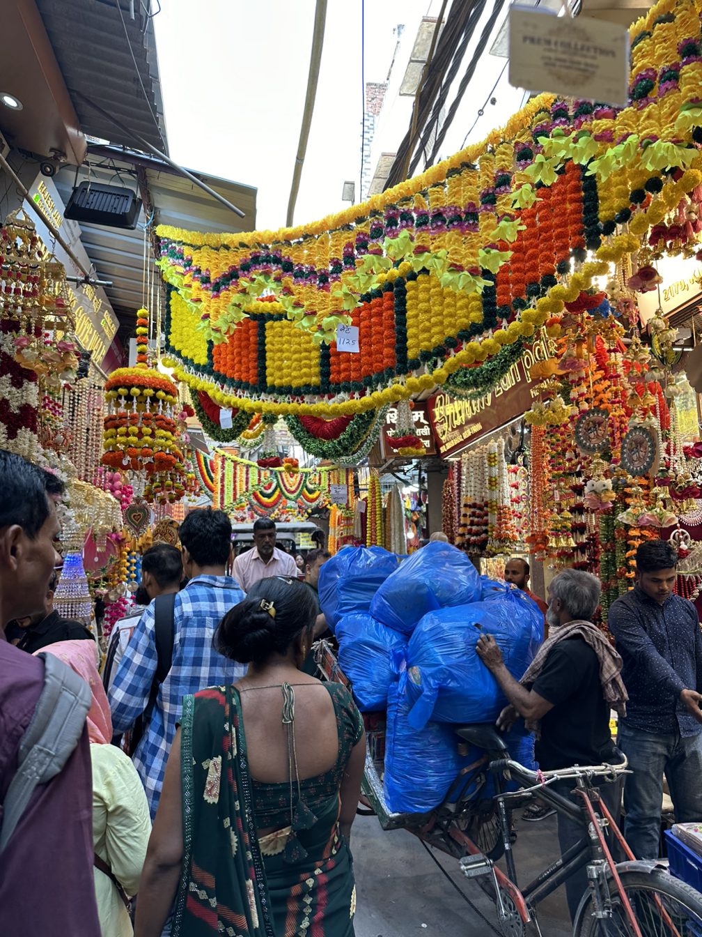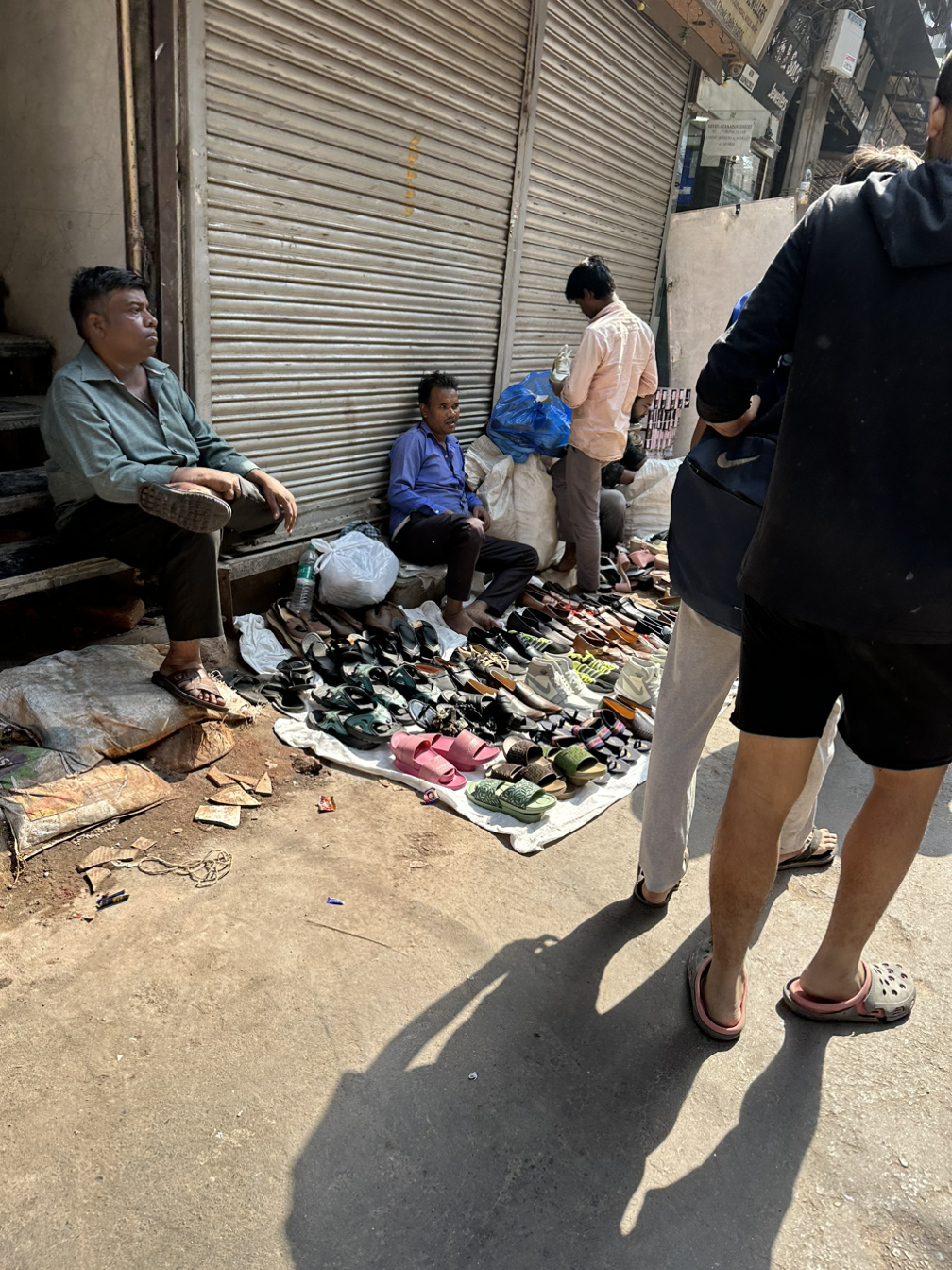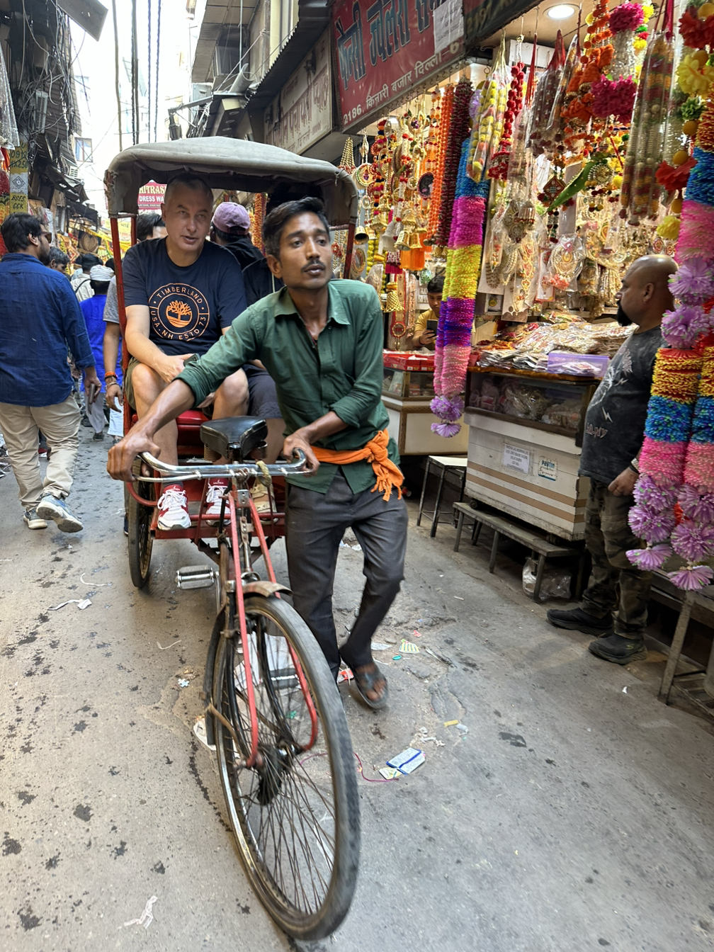 골목 안의 모습은 혼란스러운 인도의 모습 그 자체입니다. 건물에 있는 상점, 노점상, 길거리 좌판이 어지러이 뒤섞여 있습니다. 쇼핑하는 사람들 사이를 자전거 릭샤, 오토 릭샤, 오토바이가 아슬아슬하게 비집고 다닙니다.