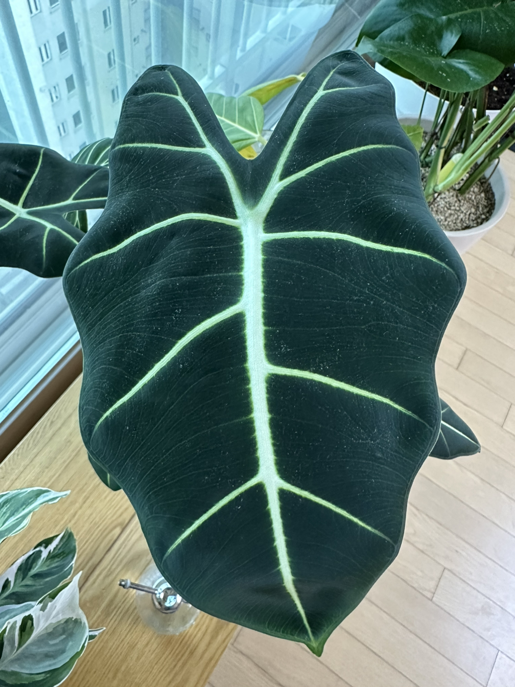계기는 지난 연말부터 저를 괴롭힌 집안일과 직장일 때문이었습니다. 난데없이 연속적으로 터진 사고와 사건에 정신이 나가버린 상태였기에 기분을 바꿔줄 무엇이 절실했습니다. 우연한 기회에 방문한 화훼시장에서 신기한 모습의 식물을 한그루 들이게 되었고 그 이후에 십 여종을 더 사며 식집사의 길로 들어서게 되었습니다. 하루에 거울 한번 들여다보지 않는 사람이 아침, 저녁으로 식물을 들여다보며 보살피게 되었고, 주말마다 새로운 식물을 들이고 싶은 욕망을 누르기가 쉽지 않을 지경입니다. 플랜테리어를 이해하지 못하는 집사람이 아니었다면 지금쯤 집은 열대정글이 되었을 겁니다. 아무튼 화훼시장에서 처음 만나서 저를 식집사의 길로 이끈 식물은 ‘알로카시아 프라이덱 그린 벨벳’입니다.