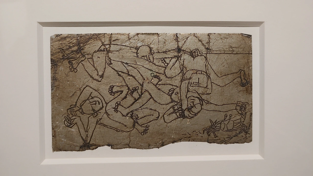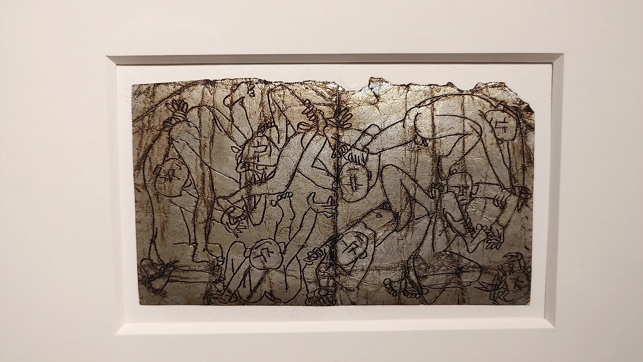 특히 전시장 초입에서 만난 낯익은 이름 ‘이중섭’ 세 글자와 그의 그림 은지화(담배 갑 속 은색 종이에 그린 그림) ‘포옹’은 가족과 떨어져 지낸 이중섭이 일본에 있는 아내와 아들에 대한 그리움을 담은 작품이다.