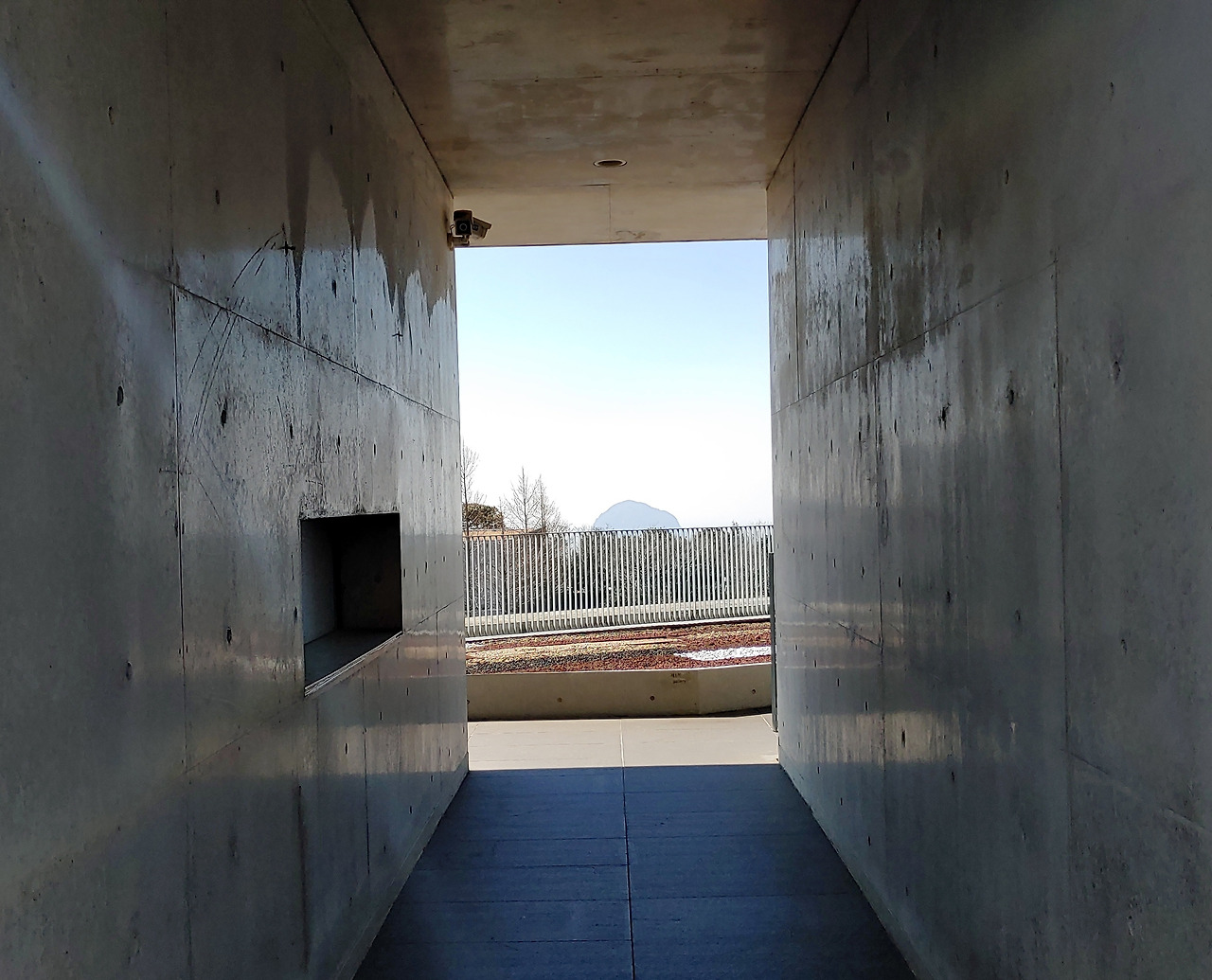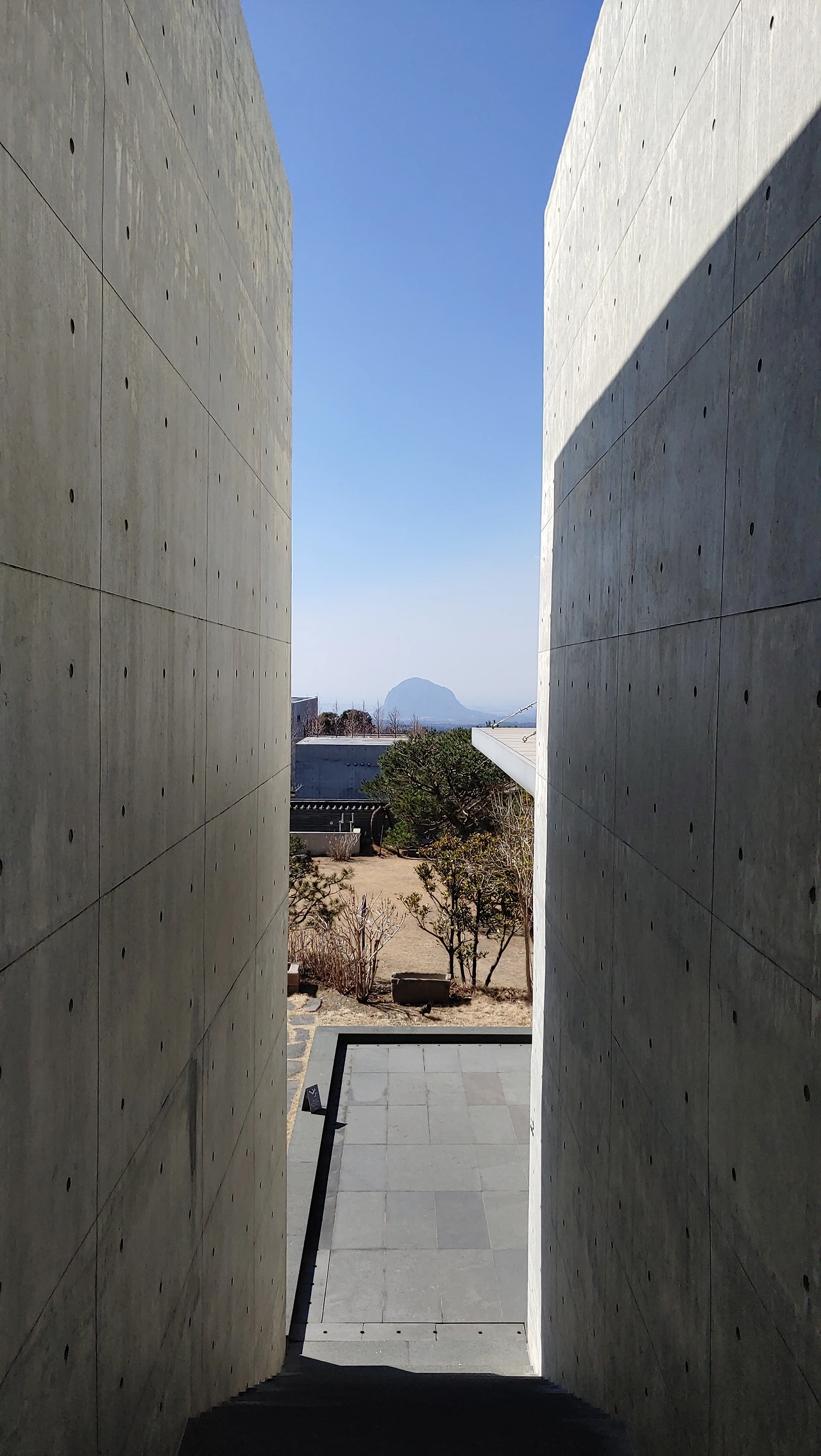 1전시관으로 가는 길 옥상으로 오르는 계단에서 뒤를 돌아보니 다시 보이는 산방산과 1전시관으로 가는 동선의 건물 벽 사이 좁은 폭 안에 들어온 산방산은 또 하나의 액자가 되어 건축에 산방산을 담은 듯했다.