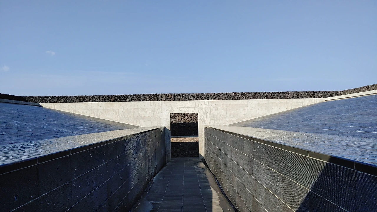 1전시관으로 가는 주 출입구 끝에 보이는 산방산 그 시선의 끝에 보이는 산방산은 건축의 세로축으로서 역할을 하며 열린 공간이었다면 그 끝에서 꺾어지면 만나는 기다란 물의 정원은 건축물의 가로축으로 느껴지며 다소 폐쇄적인 외부공간에 하늘의 창을 열어 물에 그 하늘을 담은 또 하나의 작품이었다.