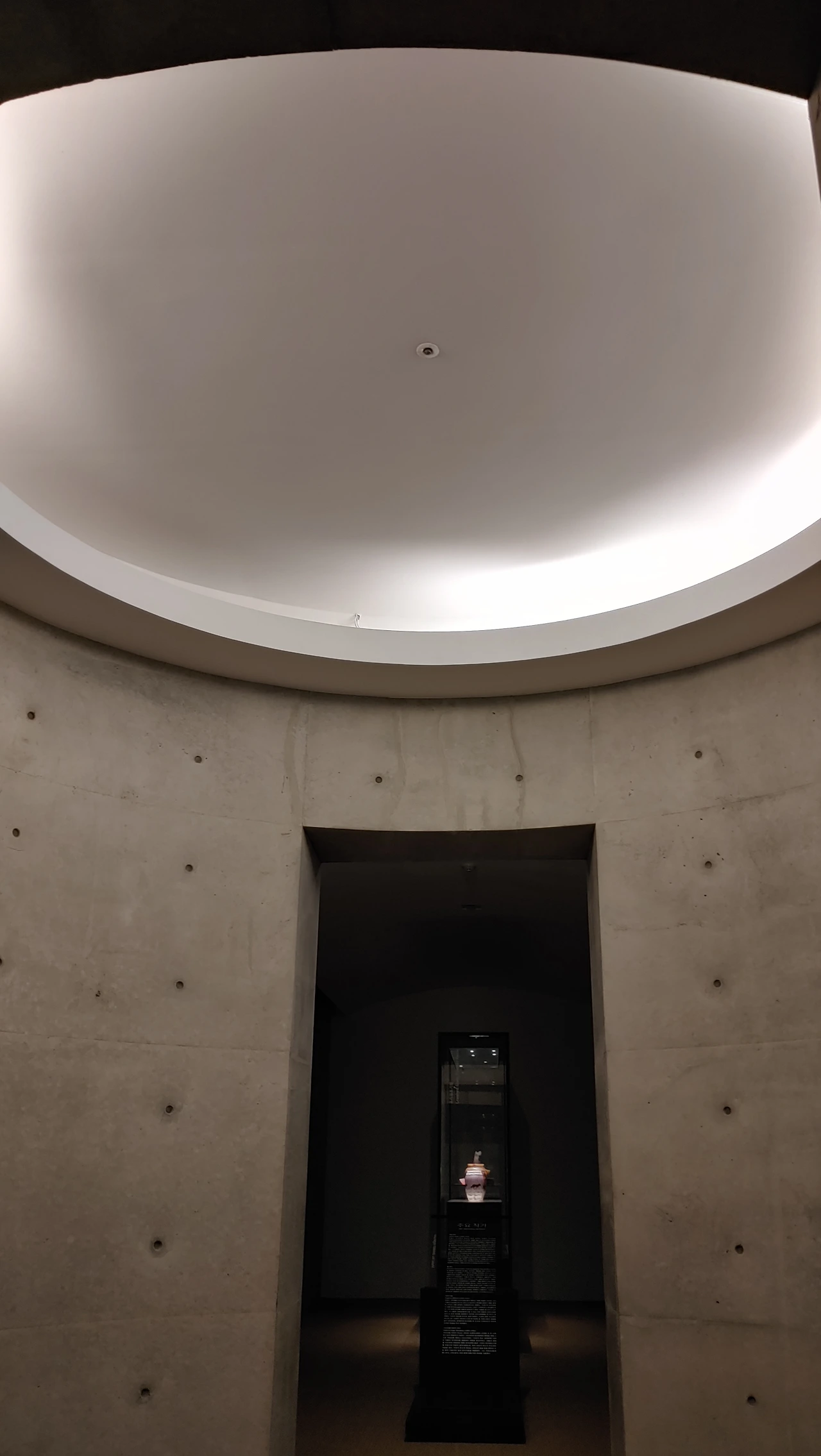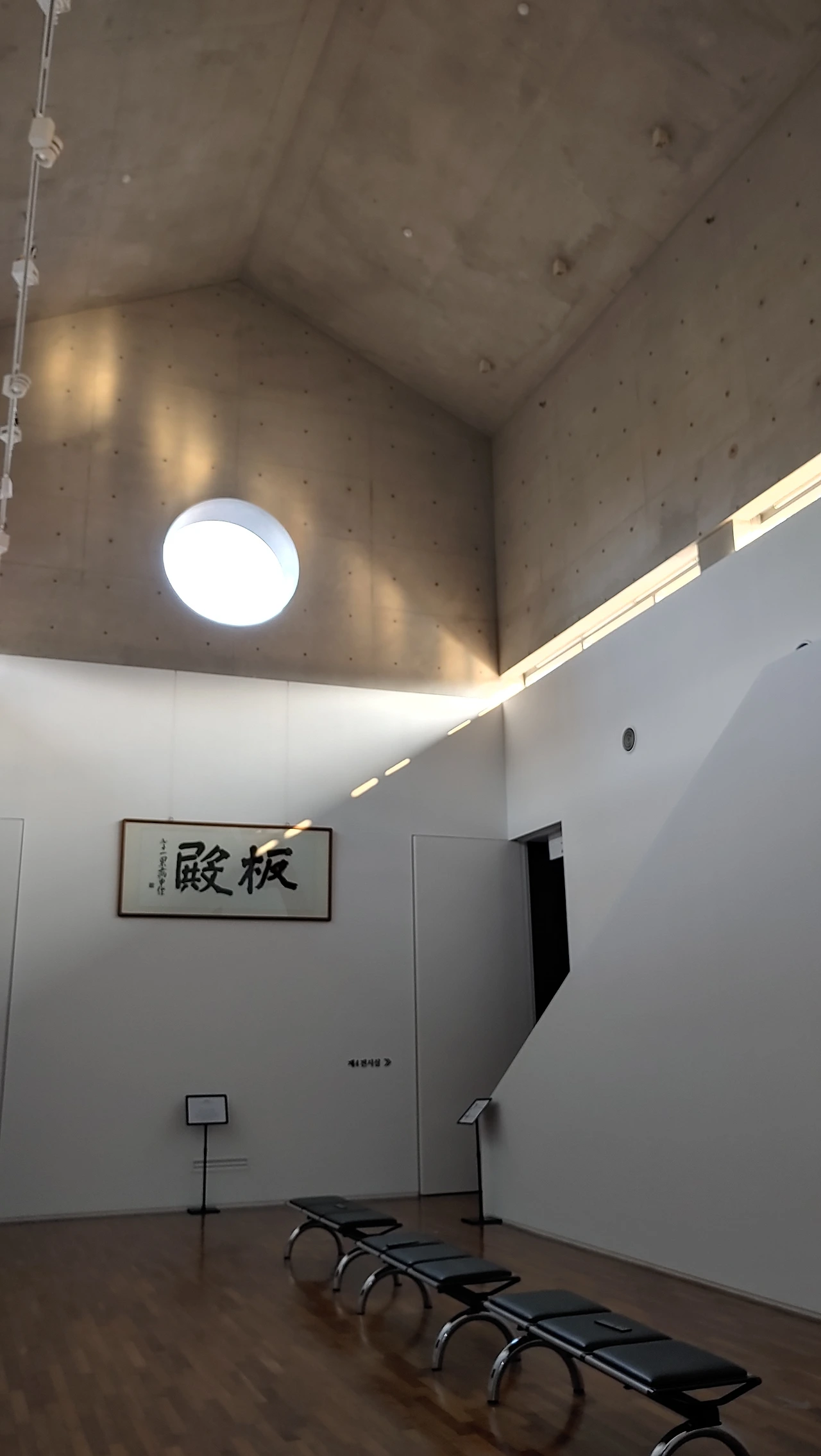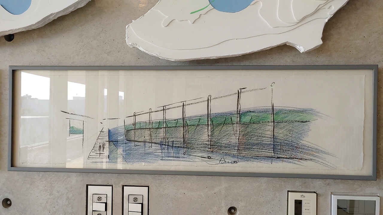 지그재그 모양의 램프를 따라 지하로 내려가면 전시실이 나오는데 땅속으로 내려 앉혀 지은 건물은 세한도와 닮으려 고민한 흔적이 아닐까 생각한다.
