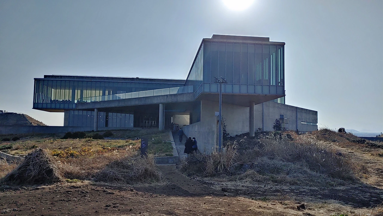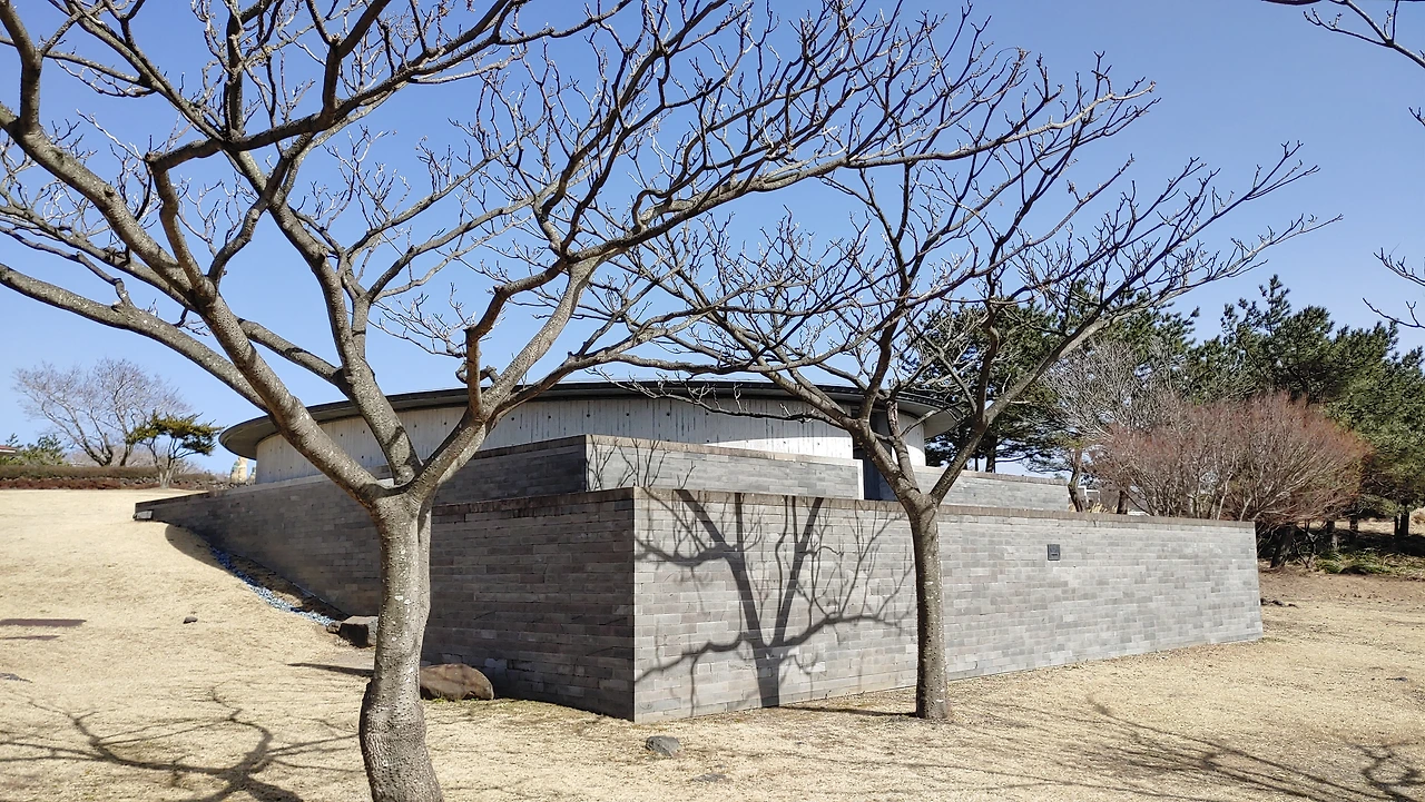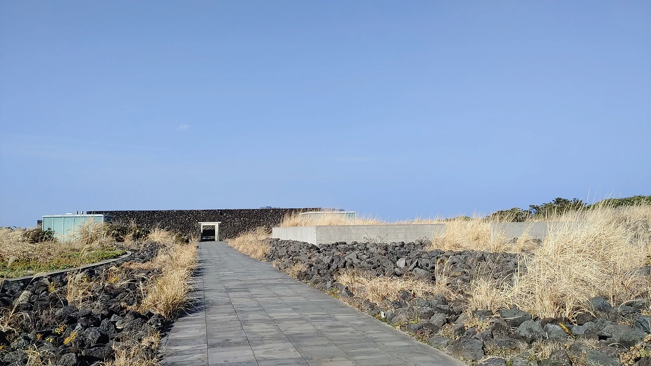 대지에 묻힌 유민 미술관 그런 섭지코지 해안 대지의 지형을 거스르지 않으려고 땅속으로 자리 잡은 건축물 유민 미술관은 건축가가 얼마나 자연을 미술관에 담으려 했는지 짐작할 수 있었고, 그런 이유로 처음 도착해서 잠시 미술관이 어디인지 찾지 못해 어리둥절함을 느끼기도 했다.