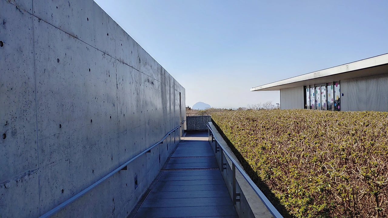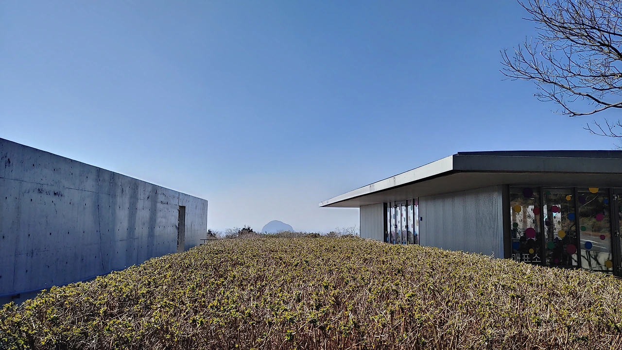 미술관 입구에서 본 성산 일출봉 실내에서는 원과, 곡선, 선과 면이 만나 다양한 공간을 연출하였고 안도 다다오 특유의 미로 같은 동선은 다채로운 작품들을 공간으로 분리하여 다양한 전시 공간으로 만들어 냈다.