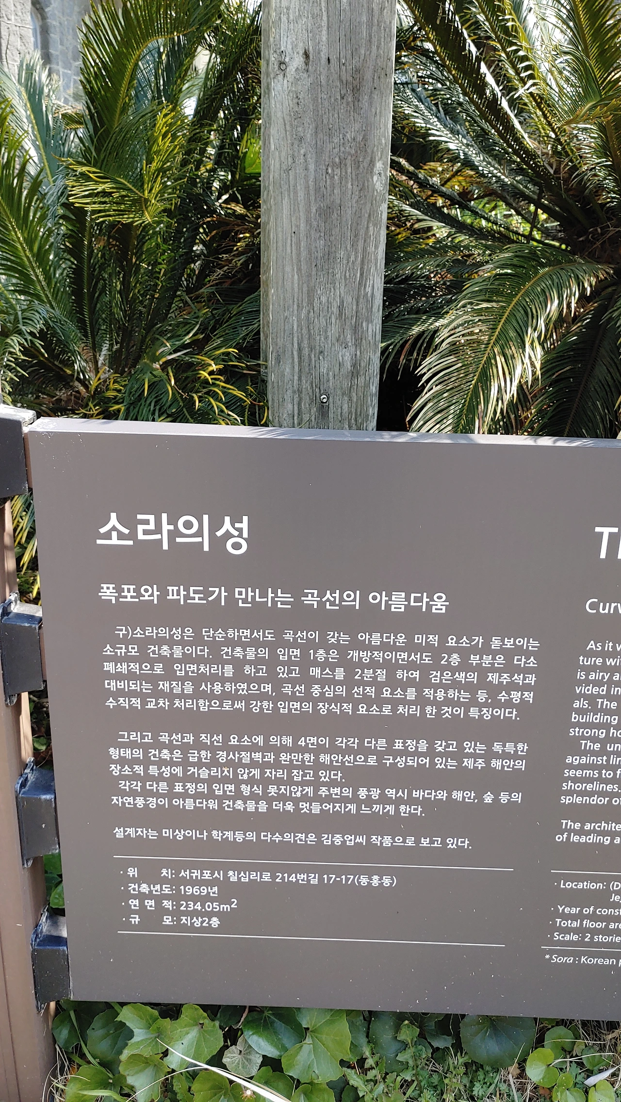 소라의 성은 소규모 건축으로 단순하지만 곡선미와 제주의 돌을 적절히 사용하여 매스의 분절을 잘 표현해 다양한 4면의 입면이 재미있는 건축물이다.