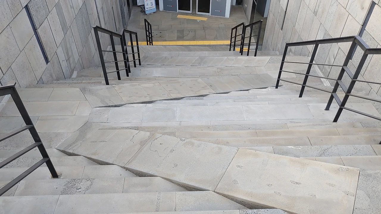 옥상오르는 계단(좌), 1 전시관 가는 동선(우) 이렇게 본태 박물관은 이름이 뜻하는 데로 자연에 순응하며 현대 미술을 박물관에 담은 듯하다.