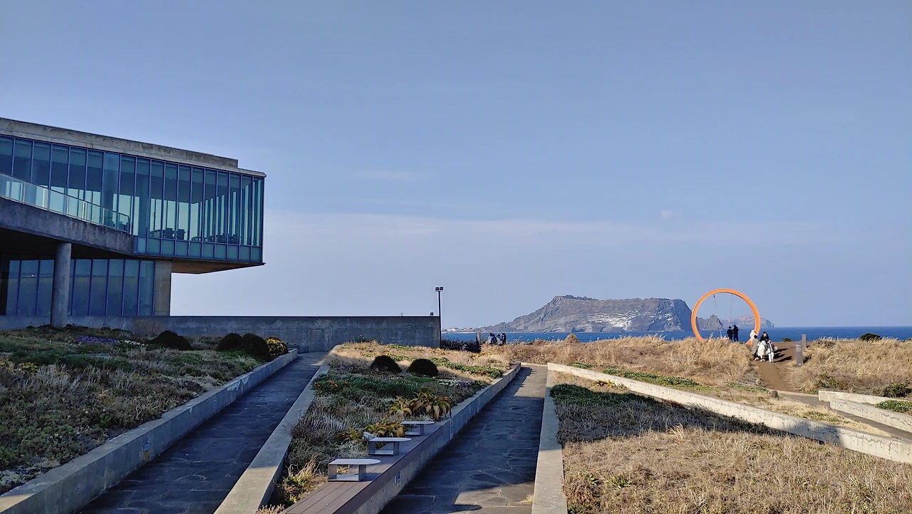 성산일출봉과 글라스 하우스 섭지코지 해안 끝자락에 위치한 글라스 하우스는 성산일출봉을 향해 두 팔을 벌려 뜨는 태양의 기운을 한껏 품어 안은 건축물 같다.