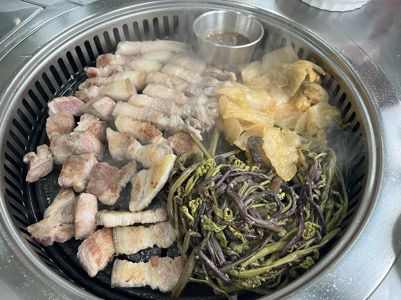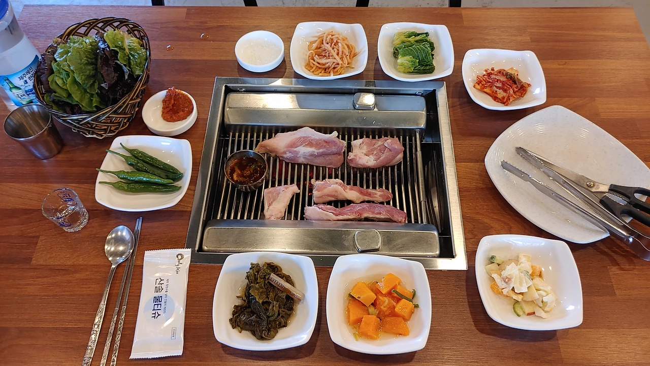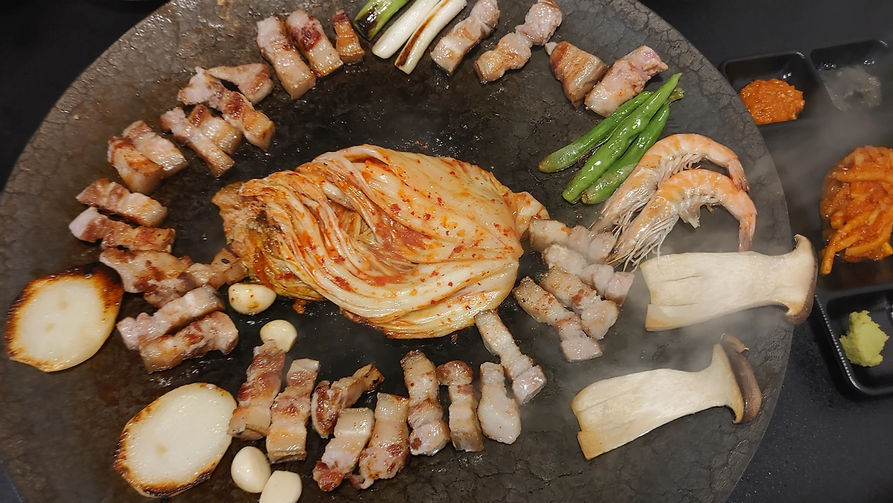 두터운 고기 살 한 덩이 화로 불 위에 올리자 “치~~” 소리와 함께 떨어진 기름이 침 한 모금 “스~읍”하고 삼키며, 코를 “흥흥” 거리게 만드는 고소한 냄새와 함께 자욱한 연기에 눈을 비벼 대다, 노릇하게 익은 고기를 그 옆 함께 끓고 있던 매콤한 땡초 썰어 넣은 멜젓에 푹 찍어 한입 씹으면 짭조름한 젓갈 맛이 먼저 혀에 닿은 뒤 고소한 고기 육즙이 입안 가득 터지고, 그 뒤를 이어 땡초가 깔끔하게 잡아주면, 마지막은 소주 한잔 꺾어 넣으면 절로 “캬~~” 하는 소리를 내뱉게 한다.