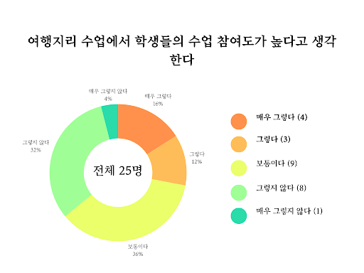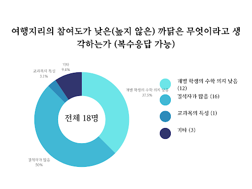 여행지리 수업은 ‘기타’ 답변에서 너무 많은 수강 인원과 넓은 강의실을 지적받기도 했다. 개별 학생의 수학 의지 및 결석자 수에 대한 지적이 가장 많았던 것을 고려하면 일부 학생의 의욕이 너무 낮은 데다 교사가 각 학생에게 집중하기 어려운 환경이었던 게 수업에 큰 영향을 미쳤음을 알 수 있다.