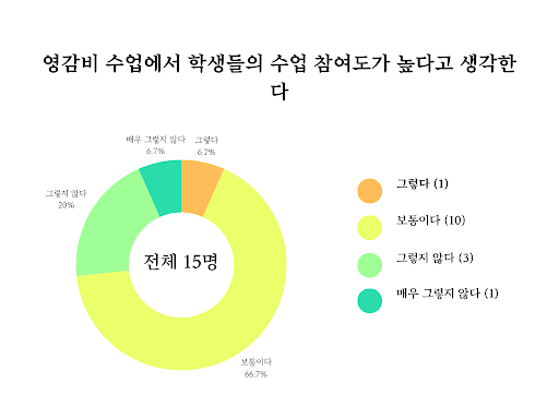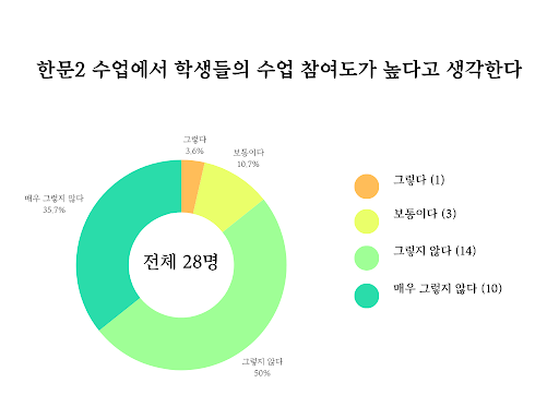 실용 국어 수업은 모든 응답자가 수강생의 수업 참여도가 높다는 데 동의했다. 반면, 다른 세 과목은 수강생의 수업 참여도가 높지 않다고 응답한 비율이 훨씬 높았다. 한문2 수업은 전체 응답자 중 한 명을 제외한 96.4%가 학생의 수업 참여도가 높지 않다고 답했으며, 그중에서도 학생의 수업 참여도에 대해 ‘보통’이라고 답한 비율이 10.7%밖에 되지 않았다. 여행지리의 경우 학생의 수업 참여도가 높은지에 대해 ‘보통이다’라고, 답한 학생이 36%로 가장 많았으며, 학생의 수업 참여도가 높지 않다고 답한 학생은 전체 응답자 중 72%였다. 영감비도 수업 참여도가 높다고 생각하지 않는 학생 중 ‘보통이다’를 선택한 학생이 66.7% 가장 많았으며, 학생의 수업 참여도가 높지 않다고 답한 학생이 전체 응답자 중 93.4%에 달했다.
