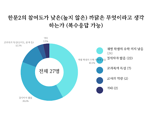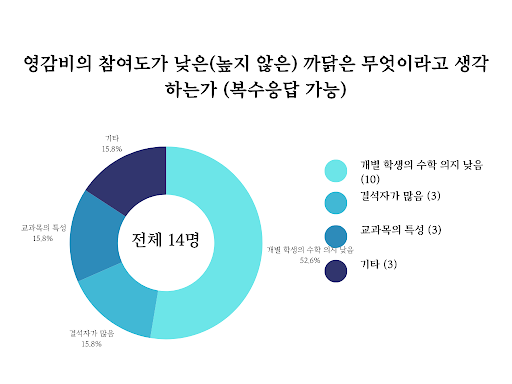 수업 참여도가 높다/낮거나 높지 않다고 답변한 이유를 묻는 하위 문항에 대한 답변으로부터 어떠한 문제점을 발견할 수 있었다. 수업 참여도가 낮거나 높지 않다고 응답한 학생을 대상으로 그 까닭을 묻는 문항에서 여행지리와 영감비 모두 개인의 태도를 지적하는 대답의 응답률이 높았다. 여행지리의 경우 학생들의 수업 참여도가 높지 않다고 생각하는 까닭 중 87.5%가 ‘개별 학생의 수학 의지 낮음’과 ‘결석자가 많음’이었다. 영감비 역시 학생들의 수업 참여도가 높지 않은 까닭 중 68.4%가 두 항목에 몰려 있었다. 이는 한문 2에서도 동일하게 나타난 현상으로, 응답 중 80.7%가 다음 두 항목이었다. 세 과목 모두 ‘개별 학생의 수학 의지’가 ‘결석자가 많음’보다 많이 뽑힌 응답이었다는 것도 눈여겨볼 점이다.