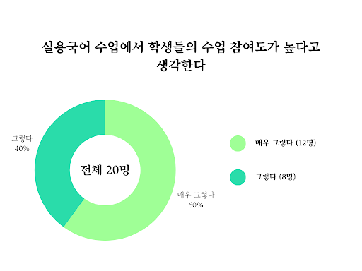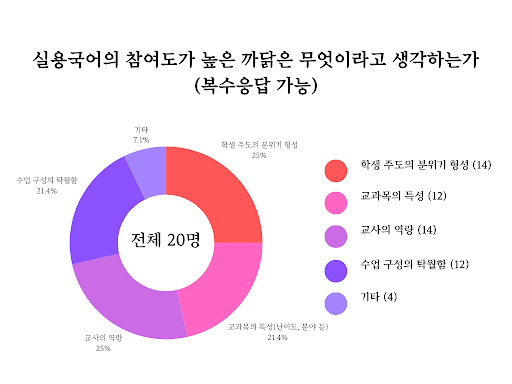 반대로 실용 국어 수업의 경우 수강생 전체가 이 교과의 학생 수업 참여도가 높다고 답변했다. 그 까닭에 대한 답변은 모든 항목에 고르게 분포되어 있었는데, 이는 학생 개개인의 의지와 더불어 수업의 설계 및 교사의 역량 모든 면에 뛰어났음을 뜻한다. 또한 기타 답변 4개 중 2개가 ‘재미있다’였으며 다른 답변도 ‘자기가 좋아하는 걸 하는 수업’, ‘수강 신청 시 구글폼을 통해 수업을 제대로 이해시킴(실용국어 수업은 인당 한 권의 책을 완성하는 수업으로, 수강신청을 한 학생에게 수업에 들어가기 전 책 제본에 대한 지식 및 의지를 묻는 구글폼을 작성하도록 했다)’ 을 골랐는데, 이는 학생 전원이 적극적으로 수업에 참여하도록 환경이 조성했음을 드러낸다.