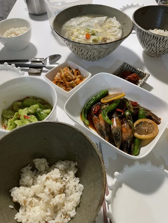 귀리밥, 간장새우, 만둣국, 오이탕탕이