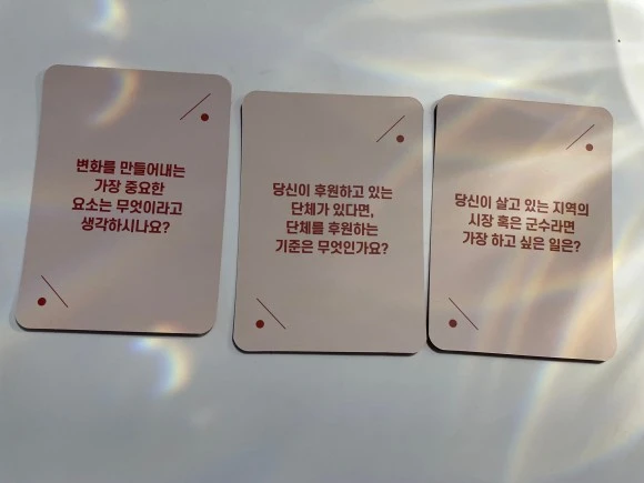 그 중 제일 우리의 취향과 맞았던 질문은 '활동과 관련된 질문' 파트였다. 우리는 활동가가 아닌 사람도 있지만 가치를 추구하는 삶을 지향한다는 점에서 비슷한 면이 있기 때문인 듯 하다. 뽑은 카드 세 장의 질문은 이러했다.