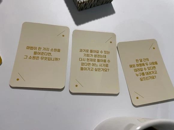 한 번쯤은 생각해볼만한 질문 / 개인적인 질문 / 활동과 관련된 질문. 이렇게 세가지 주제로 들어있었다. 모임 며칠 전 코로나에 걸려 집에서 격리 중이던 한별이와는 페이스타임으로 함께 했다. 정확한 활용방식을 보진 않았지만 우리는 돌아가며 한 장 씩 뽑고 모두 답변하는 형태로 진행했다.
