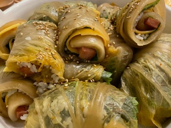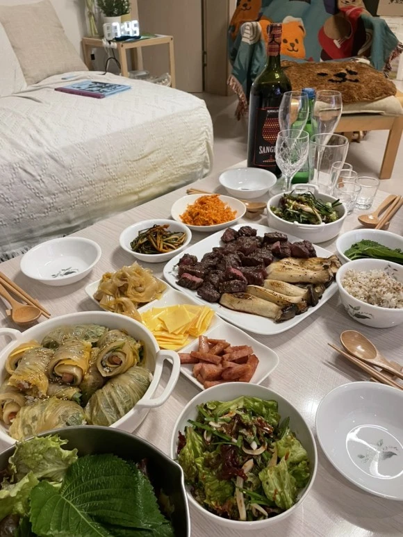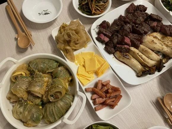 손 크기로 유명한 한별이는 역시나 묵은지김치쌈밥을 이따만큼 만들고 있었음. 소고기는 에어프라이어가 알잘딱깔센 구워줬다.