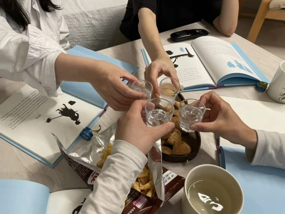 책 펼쳐두고 먹던 소주 마시며 이야기 나누기. 밥상 치우면서 너무 자연스럽게 소주잔은 남겨둔거 웃김. 일단 짠 하면서 시작해볼까.