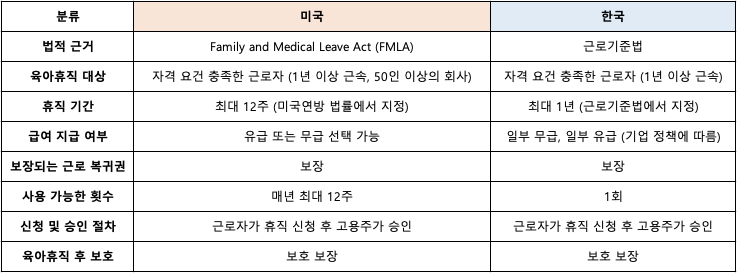 <미국과 한국의 육아휴직 기준>