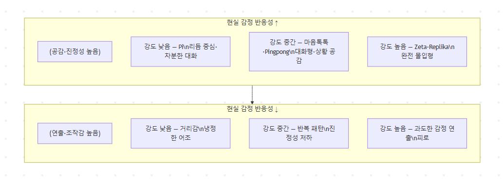 - 상단(공감·진정성 높음) : AI가 감정을 세밀하게, 사람처럼 표현하는 영역.