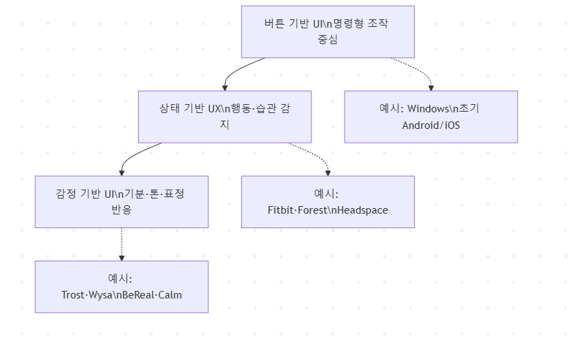 Wysa, Calm, Trost, BeReal, Feelim 같은 앱들은 감정을 인식하고, 반응하고, 피드백을 조정하는 UX 구조를 갖췄습니다. 이것은 단순한 시각적 인터페이스가 아니라, 정서적 인터페이스(Emotional Interface)의 시대가 된 것입니다.