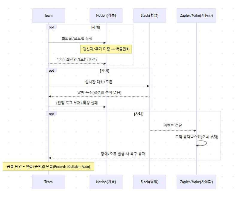 이 시퀀스는 스타트업이 툴을 잘못 연결했을 때 발생하는 3가지 전형적인 실패 패턴을 보여줍니다. 참여자는 T(Team), N(Notion - 기록), S(Slack - 협업), Z(Zapier/Make - 자동화) 라고 보시면 됩니다.