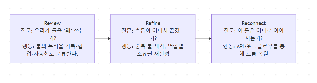 툴 실패의 반대는 ‘완벽한 시스템’이 아닙니다. 끊기지 않는 흐름을 봐야만 합니다. 기록은 협업으로, 협업은 자동화로, 자동화는 다시 기록으로 돌아가는 그 리듬이 살아 있는 조직은 쉽게 무너지지 않습니다.