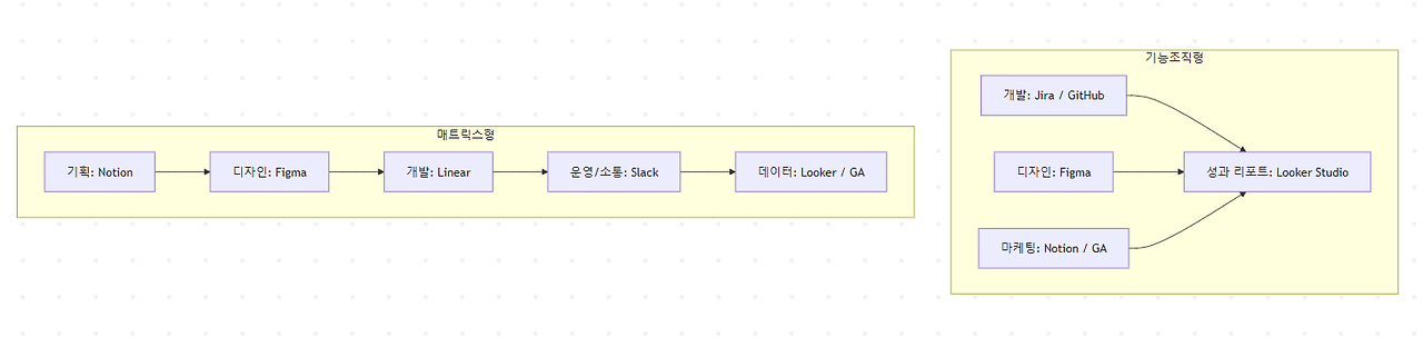 툴은 다시 일하는 리듬을 결정합니다. 기능조직의 핵심은 “정확성”, 매트릭스 조직의 핵심은 “연결성”이라고 볼 수 있습니다. 성장의 어느 시점이든, 두 가지 중 하나가 무너지면 팀은 바로 피로에 빠져 들게 됩니다. 그 피로의 신호는 언제나 툴에서 가장 먼저 나타타게 됩니다.