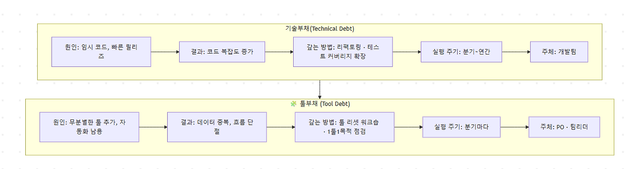 → 기술부채는 개발의 리듬을 늦추고, 툴부채는 조직의 호흡을 깨뜨립니다.