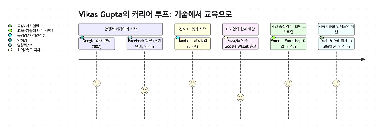 2000년대 초, Vikas Gupta는 Google의 제품 매니저로 입사하며 테크 산업의 한복판에 뛰어들었습니다. 안정적이고 논리적인 커리어의 시작이었죠. 그 후 Facebook의 초기 멤버로 합류하며 더 빠르고 실험적인 문화 속으로 들어갑니다. 하지만 이 모든 화려한 경력을 뒤로하고, 그는 다시 처음으로 돌아가듯 스타트업 창업을 선택했고, 결국 교육 기술이라는 전혀 다른 영역으로 삶의 방향을 틀게 됩니다.