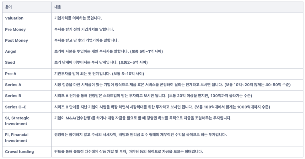- 엑싯 (Exit): 투자자는 투자금을 회수하고 회사에 지분을 가진 인원은 해당 엑싯으로 퇴직금보다 더 높은 금액을 취득할 수 있습니다. 엑싯 방법은 시리즈 C~E 단계에서 일어나는 공개시장상장과 인수합병(m&a)이 있습니다. (벨류레이션이 커서 a~b에도 엑싯을 하는 경우들도 두루 있습니다.)