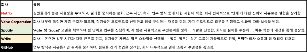 위에 해외 스타트업 5곳을 간단하게 정리해 뒀지만 내용을 보시면 해당 회사들은 자유와 자율을 기반으로 문제 해결에 적극적이고 책임감 있는 태도를 요구하며, 조직의 목표와 원칙을 고려하여 업무에 적극적으로 참여하는 것을 적극 권장하고 있는 것을 볼 수 있습니다.