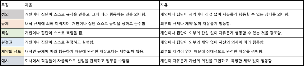- 자유: 외부의 제약 없이 자율적으로 행동할 수 있는 상태 또는 능력.